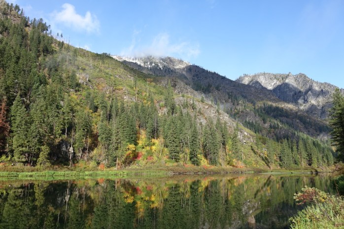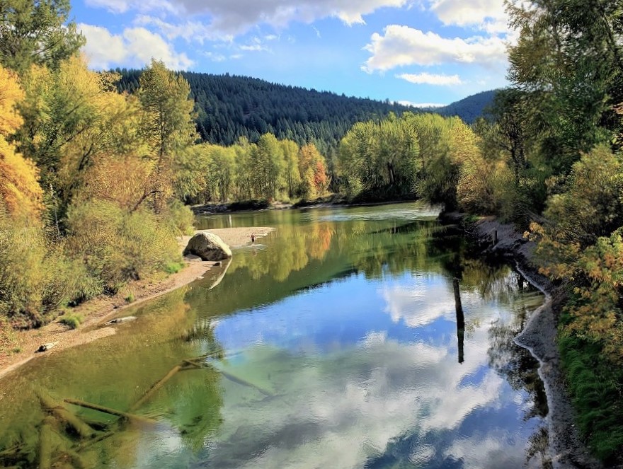 I crossed the footbridge and enjoyed the lovely fall colors reflecting in the Wenatchee River. I saw salmon swimming upstream and humans wading in the shallow waters – look closely and you’ll see them.