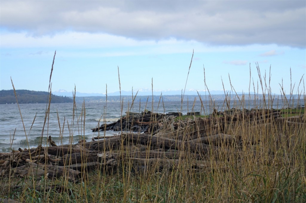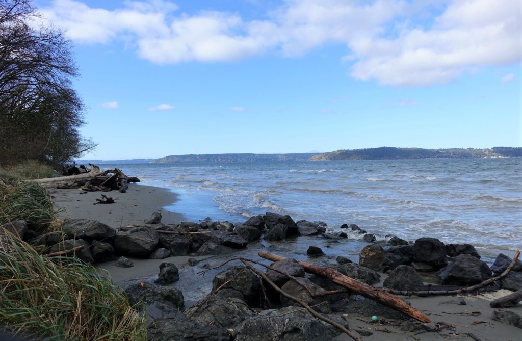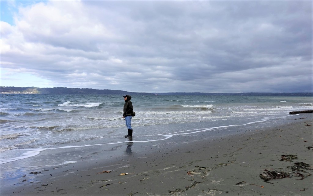 Bob wanted to practice fishing – fly fishermen are always testing new equipment and techniques – while I would wander and take pictures. So we visited Saltwater State Park and Dash Point, which like many other parks on Puget Sound, have forests that almost reach to the shore, views of the Olympic Mountains, and nice paths for walking.