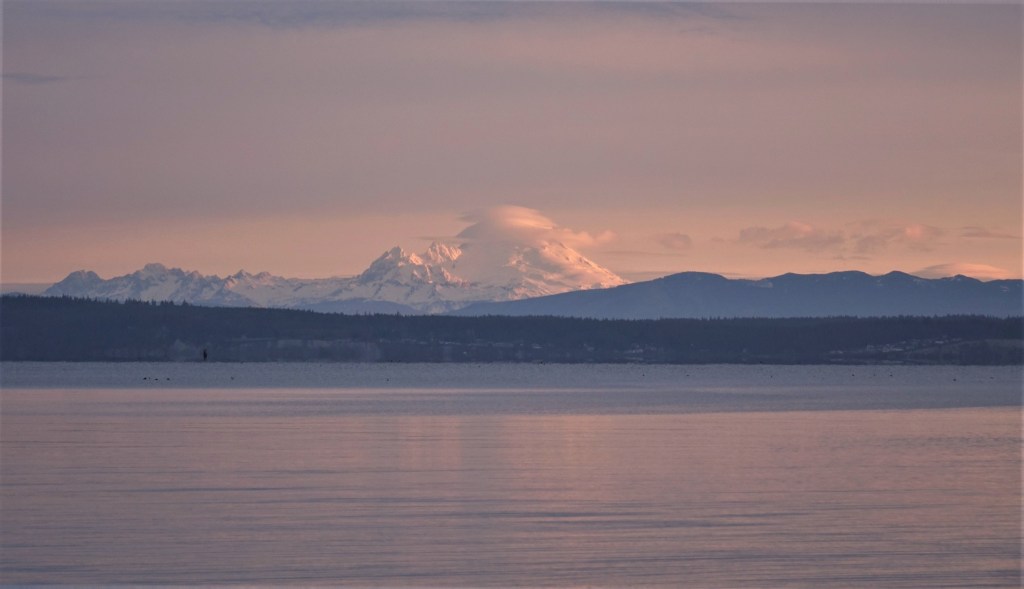 Yes, those were the Olympics. So I was surprised to see Mt. Baker on my morning beach walk, looking quite lovely in the morning light. At 10,778 feet, Mt. Baker is the tallest mountain in the North Cascades and third tallest in the state. With 10 glaciers it is second only to Mount Rainier which has 26, the most glaciers of any mountain in the lower 48. In fact, only Alaska has more glaciers than Washington State.