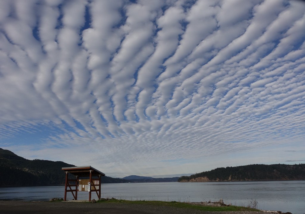 Port Ludlow was a lovely place to stay and had fabulous sunsets. But there wasn’t much to do – for that we drove to nearby Hood Canal. Our first stop was at Point Whitney where Bob fished and I wandered the oyster littered beach – the State has a shellfish lab there. But I found the best views looking up – can you believe those clouds??
