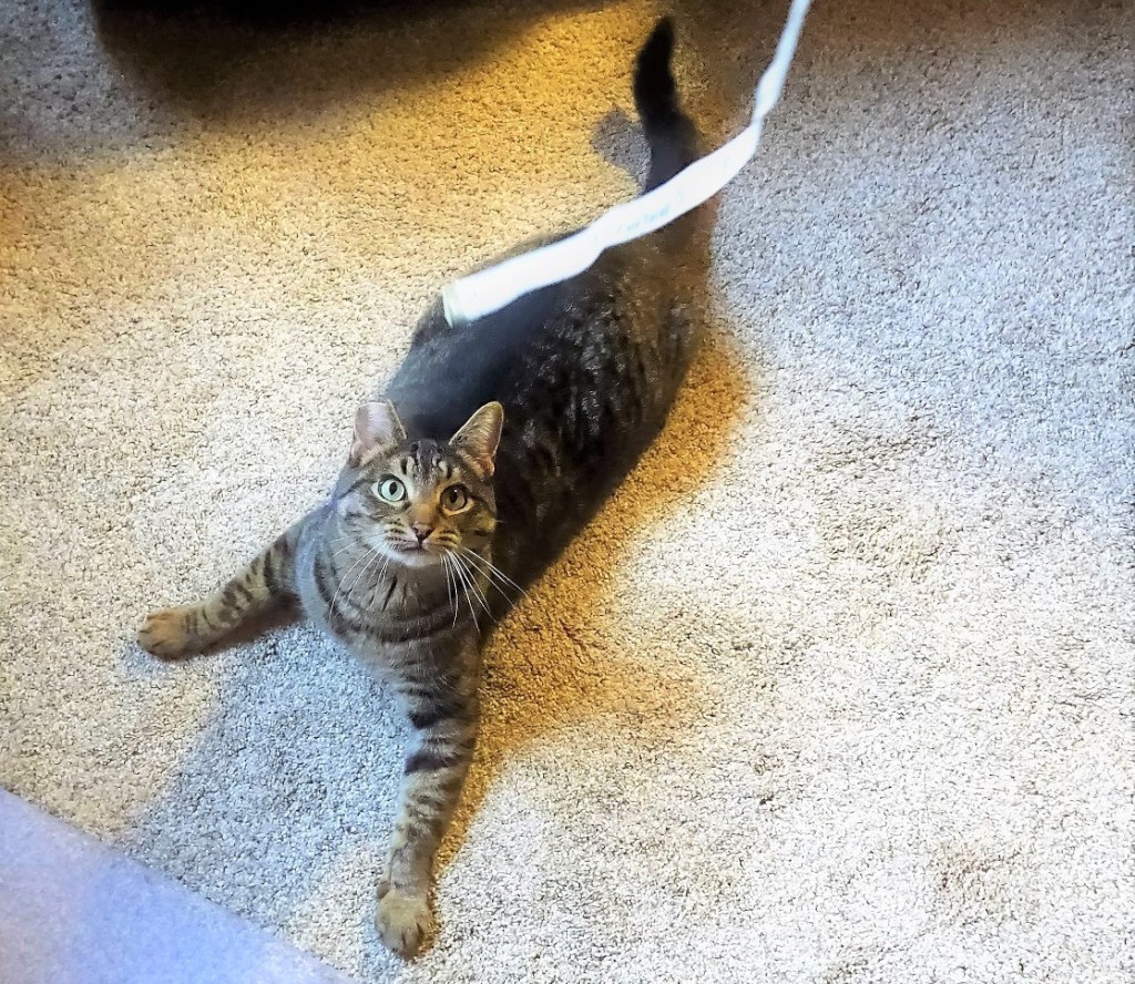 Or when they’re stuck inside in any weather! Foster has perfected the art of getting my attention by doing stuff he’s not supposed to. Usually the solution involves redirection to other activities. Measuring tapes are a good distraction. π