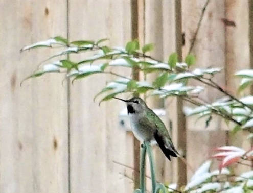 The hummingbirds waited patiently while I brought them fresh nectar; I’d forgotten to bring in the feeders last night and the contents were frozen.