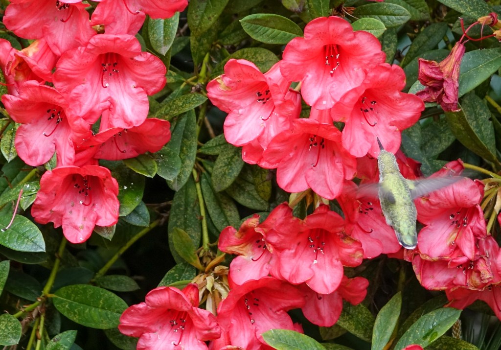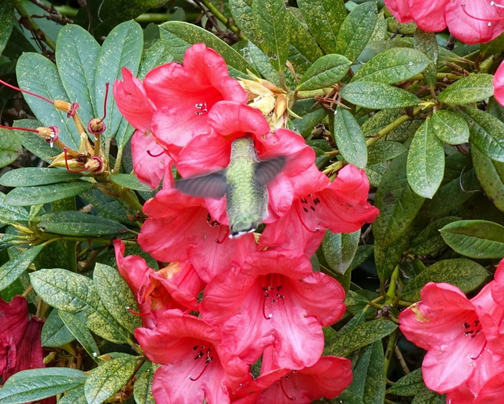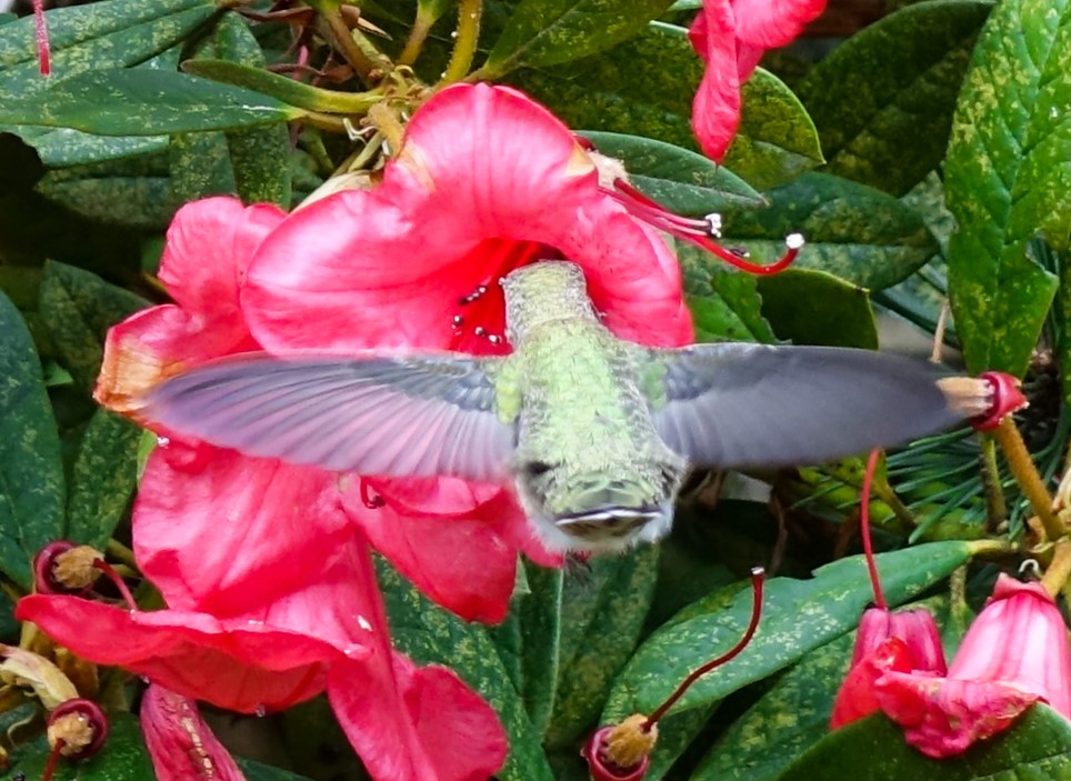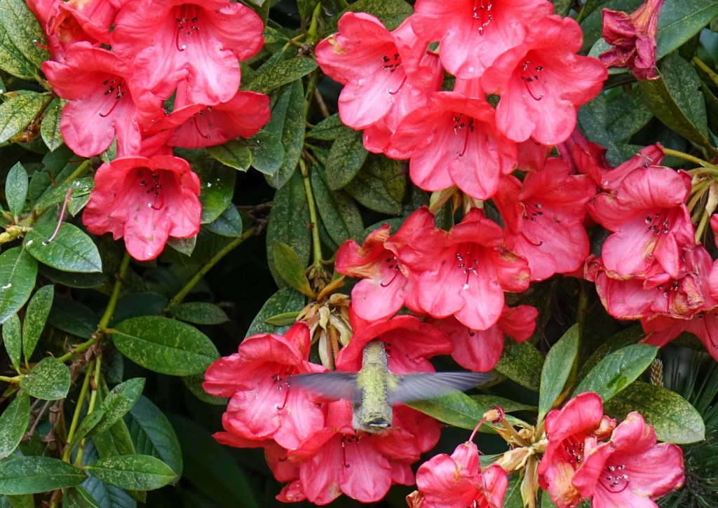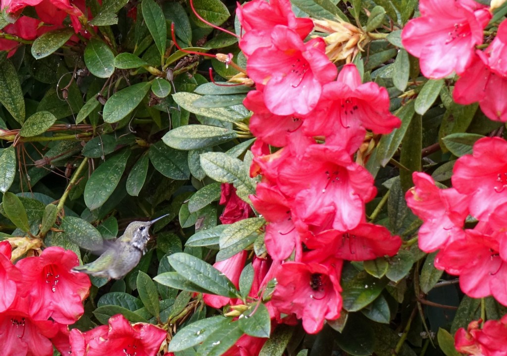 They also love rhododendrons – our Washington state flower – as I discovered one day at Soos Creek Botanical Garden. Scroll through the pictures below and see the Anna’s hummingbird feeding.