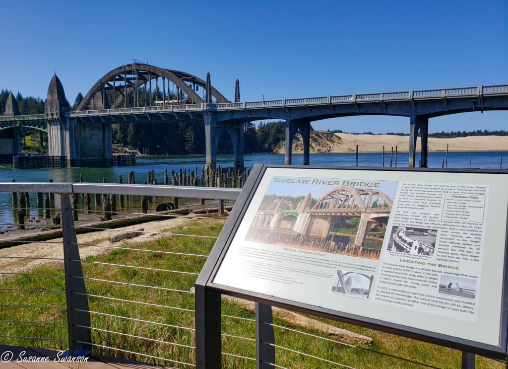 The Siuslaw Bridge opened in 1936 and is one of many funded by the Public Works Administration during the 1930’s. You can see the Oregon Sand Dunes in the distance.
