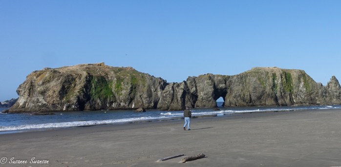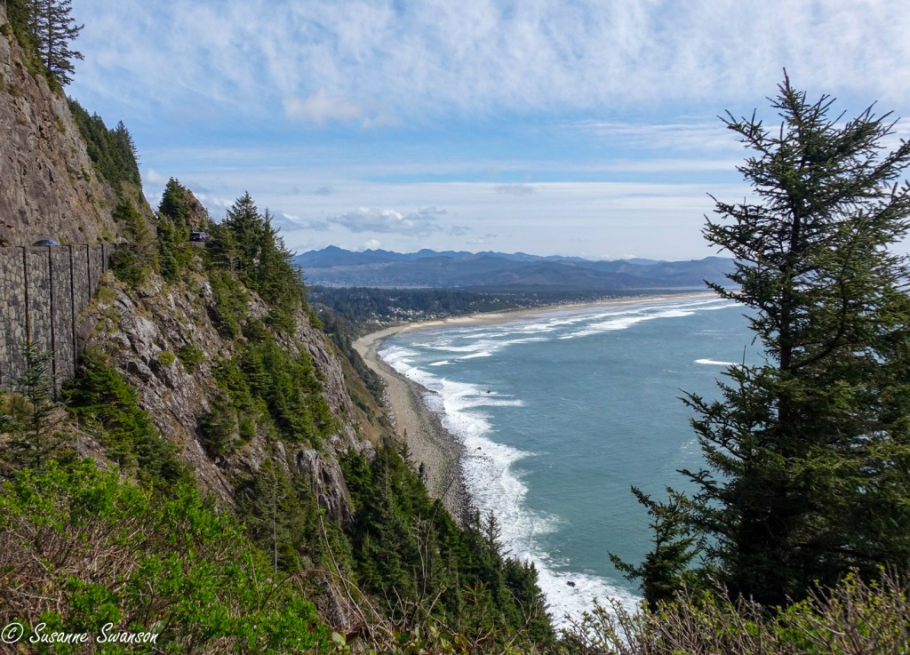 A stop at the overlook in Oswald West State Park showed us what was ahead; we’d have views like this the whole trip. We had Oswald West to thank for that, at least in Oregon. He was the governor who established Oregon’s beach highway law declaring that the entire Pacific coastline up to the high tide line would be a public highway, ensuring public access for all future generations. Squint and you’ll see the tiny cars high up on the left.