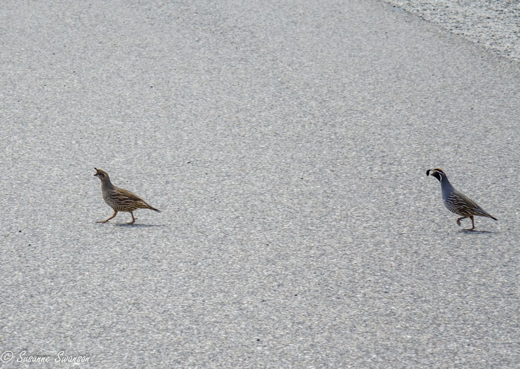 Tiny quail running across the path as fast as their feet could carry them.