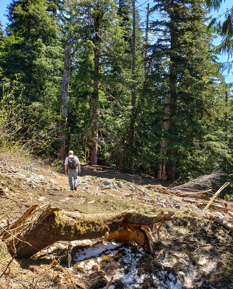 We soon encountered the only rough part of the trail – a small avalanche field of packed snow covered with fallen trees and dirt.