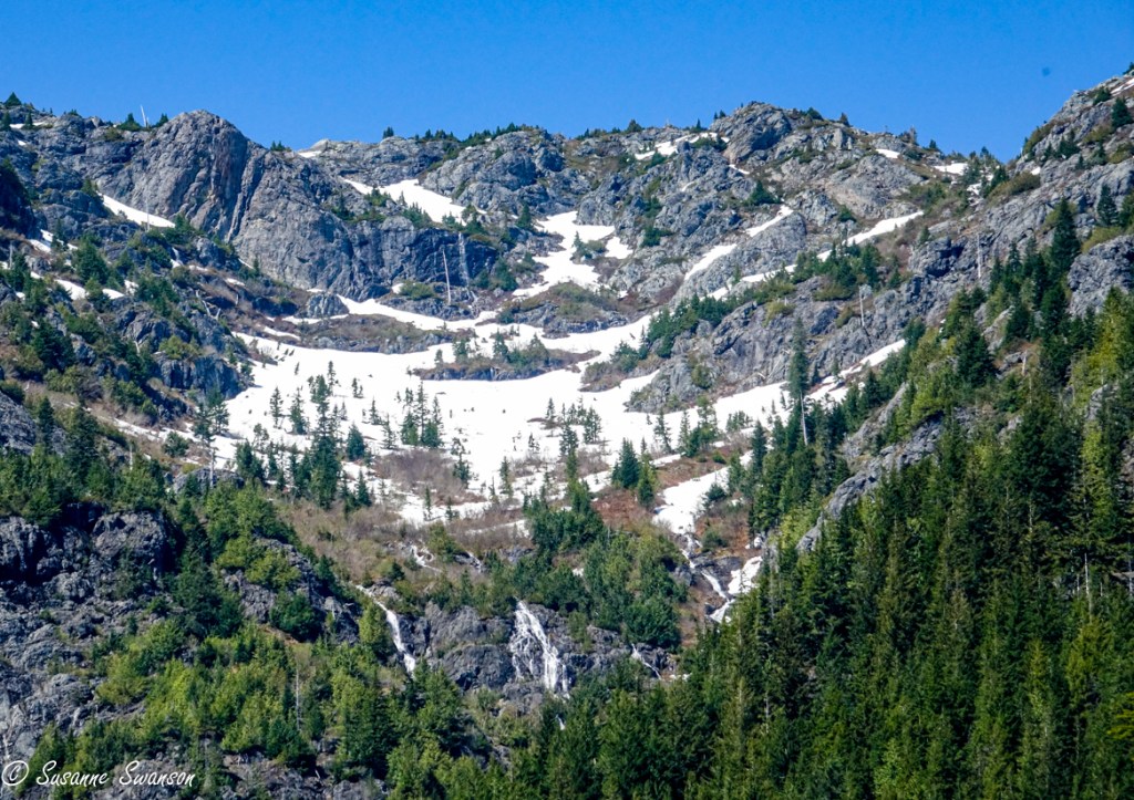 As we neared the end of the trail we enjoyed views of waterfalls high on the mountains across the valley.