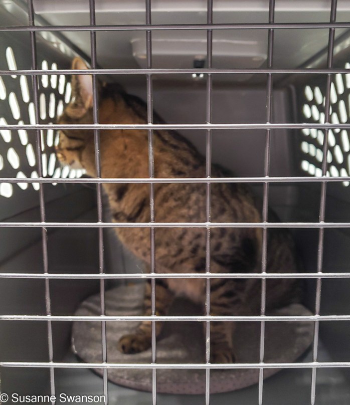 First I sprayed Feliway – a natural cat pheromone product – into the box. This would help calm him. Then as the time approached I moved the carrier closer to him but still out of sight – if he saw it, game over. I turned out the light and went to where he lay, sweet talking to him as he awoke. Then I gently picked him up and walked backwards toward the box and before he knew what happened he was in it. Hooray! The hard part was over!