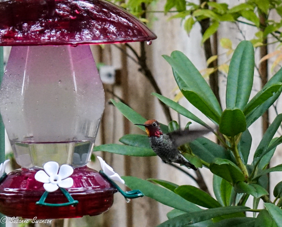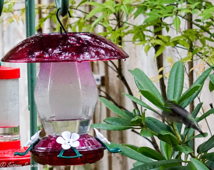 I washed the feeders, refilled and hung them, then hid in the shed nearby to watch. The hummers returned within minutes. Swoop. Drink. Reverse. Hover. Repeat.