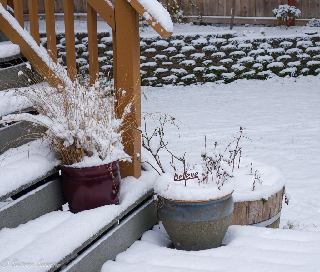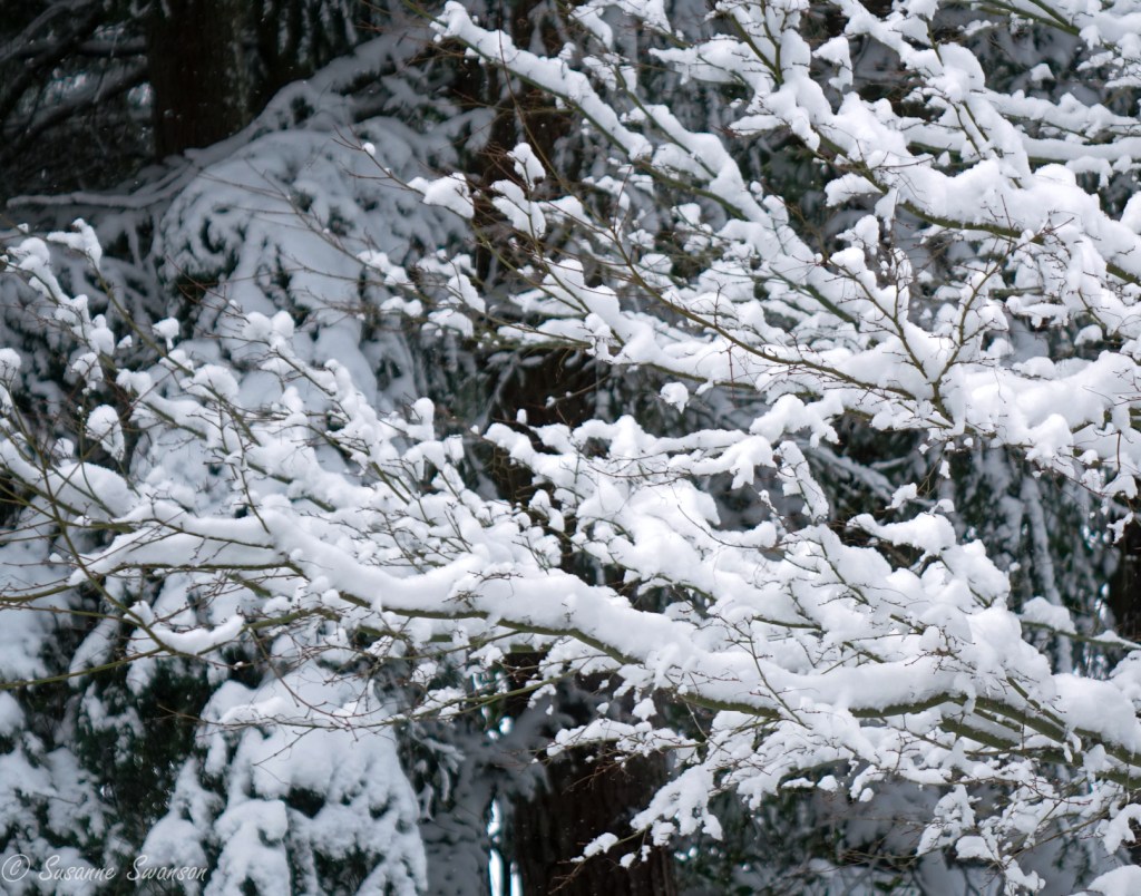 It was only a tease yesterday, the promise of a White Christmas for those who care about such things. But this morning the snow appeared, clothing the evergreens with its beauty and providing joy in the Great Northwest!