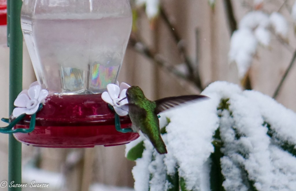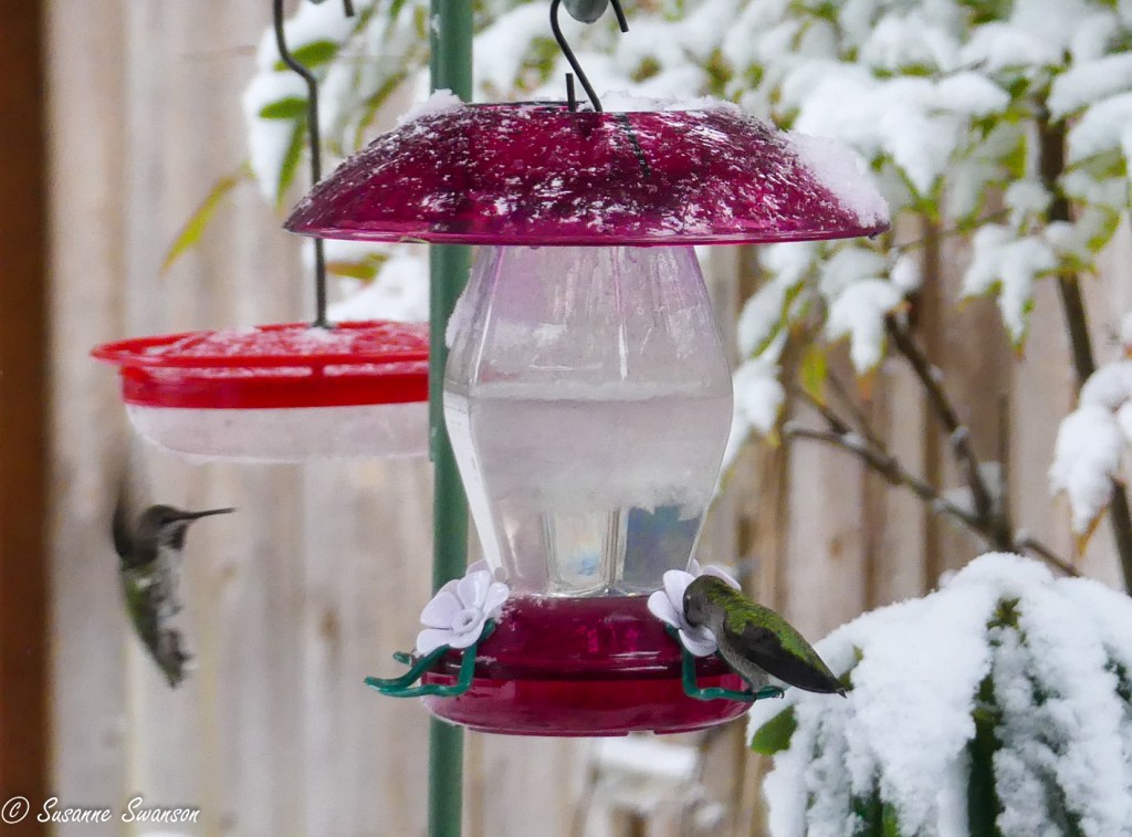 I guess you got snow…. and the hummers must be hungry. Terrific photos.