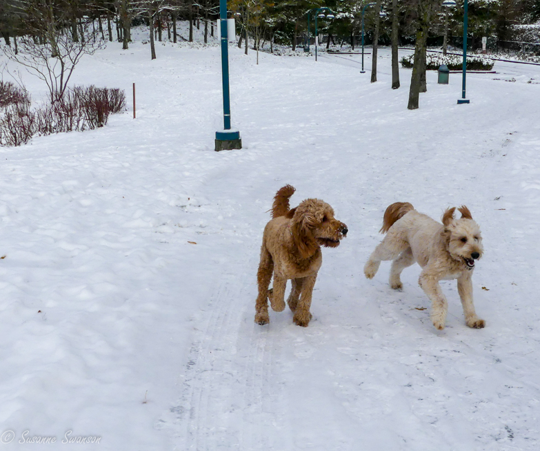 The dogs were having a blast in the snow unaware they weren’t welcome – this is a dog free park –