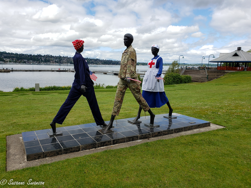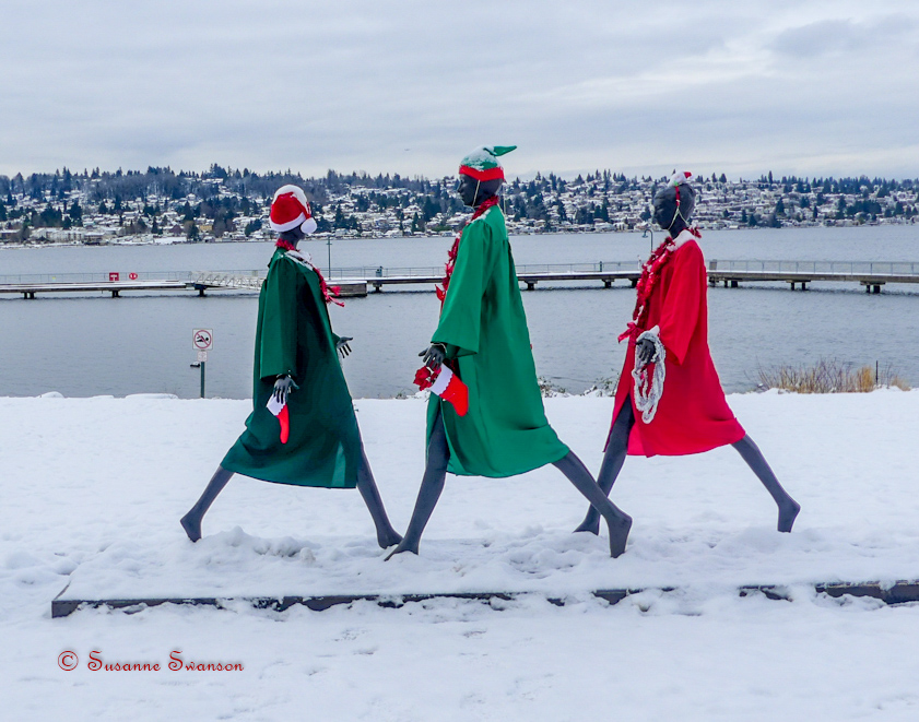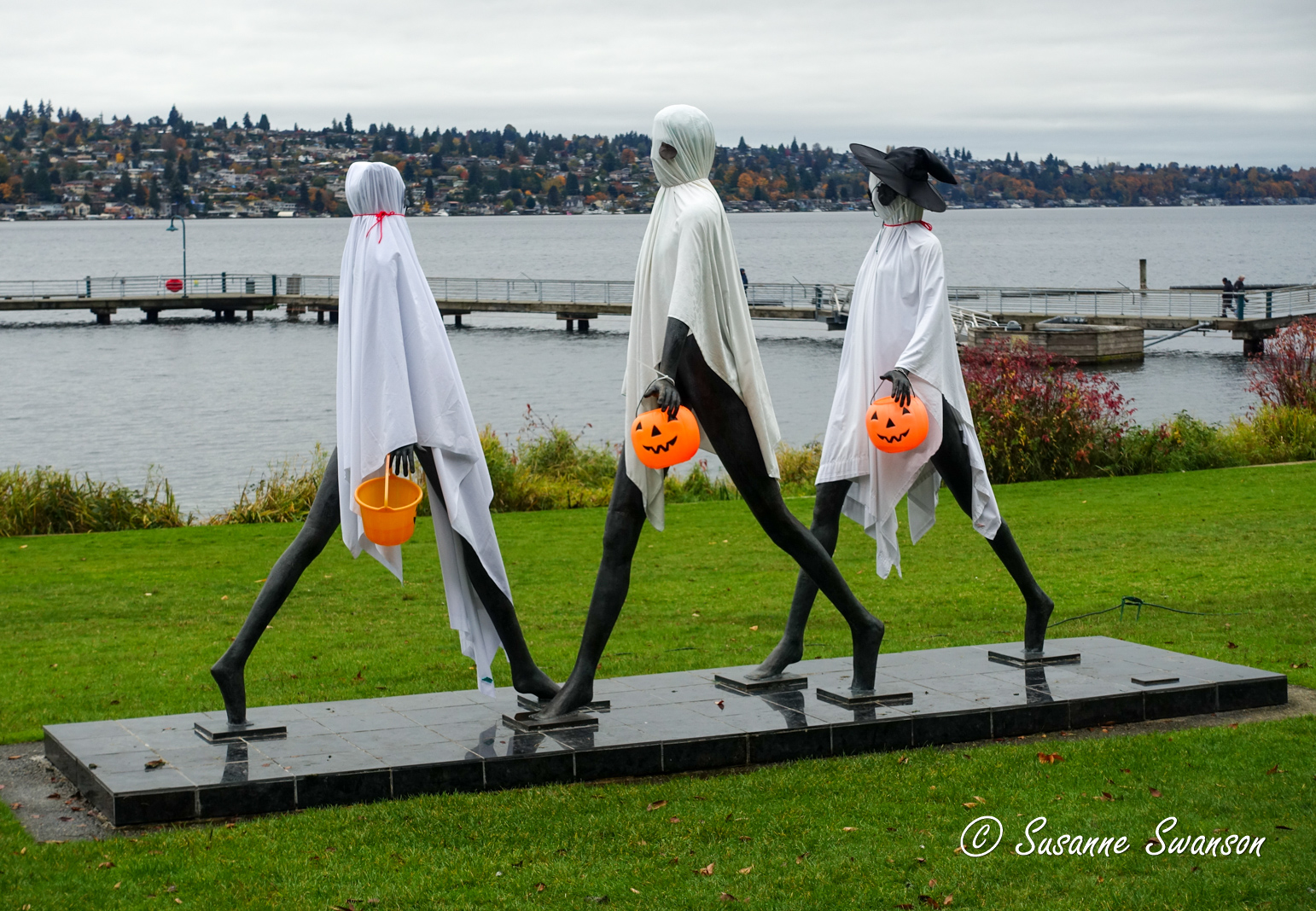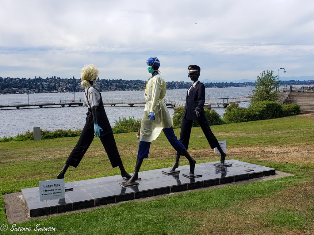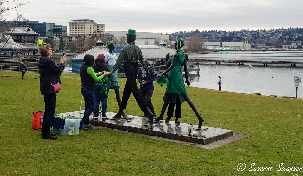 The ones I call the Stony Walkers are actually the Interface Statue, a bronze sculpture created by Phillip Levine. Acquired by the City of Renton in 1982, the figures are dressed up on special occasions, by a group of volunteers. You can read more about that by clicking here.