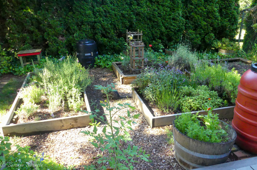 I have four raised garden beds; three of them are filled with herbs and roses; a bit messy perhaps but their colors and fragrance bring me joy.