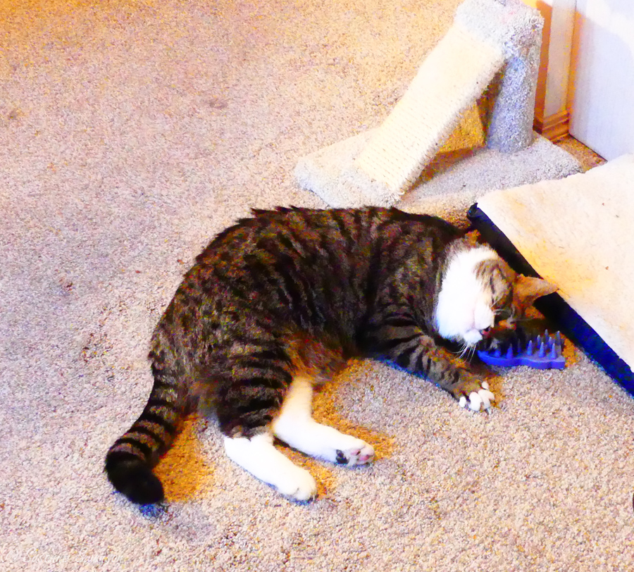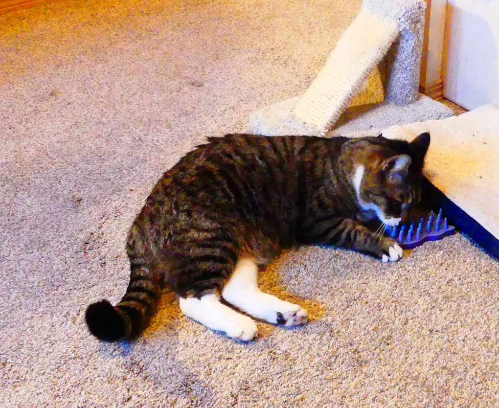 Tiger is satisfied being near me in my office and loves a good brushing.