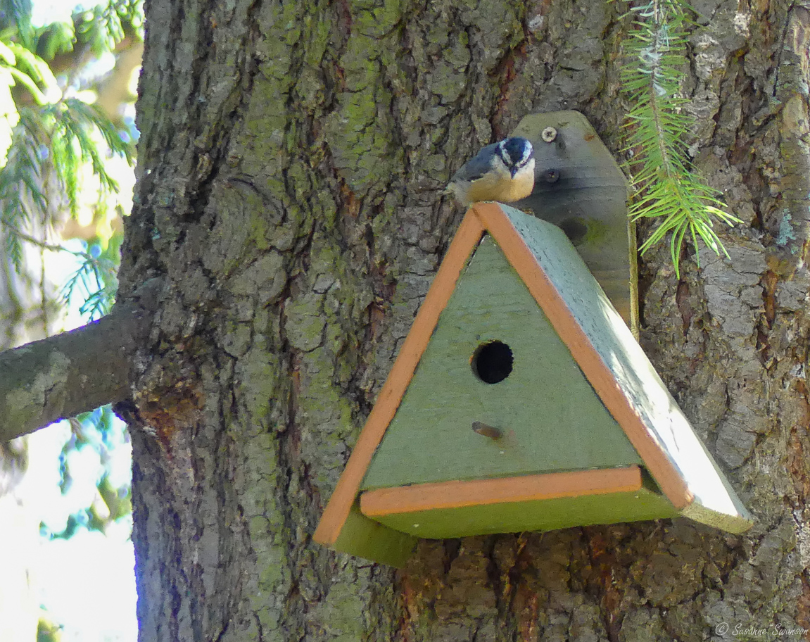 The brown creeper hides in plain sight – completely camouflaged! Not sure whether he’s interested in the new house mounted nearby.