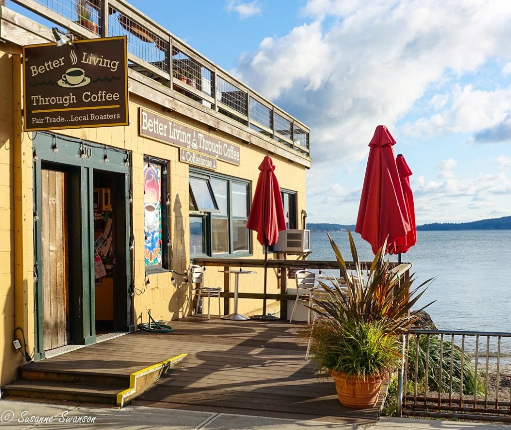 I love coffee too, and especially in a cosy coffee shop or on a street/terrace/deck with a view π That ‘Better Living Through Coffee’ place looks a bit familiar – could it possibly be in Port Townsend? We had breakfast in a place that looked very like that!