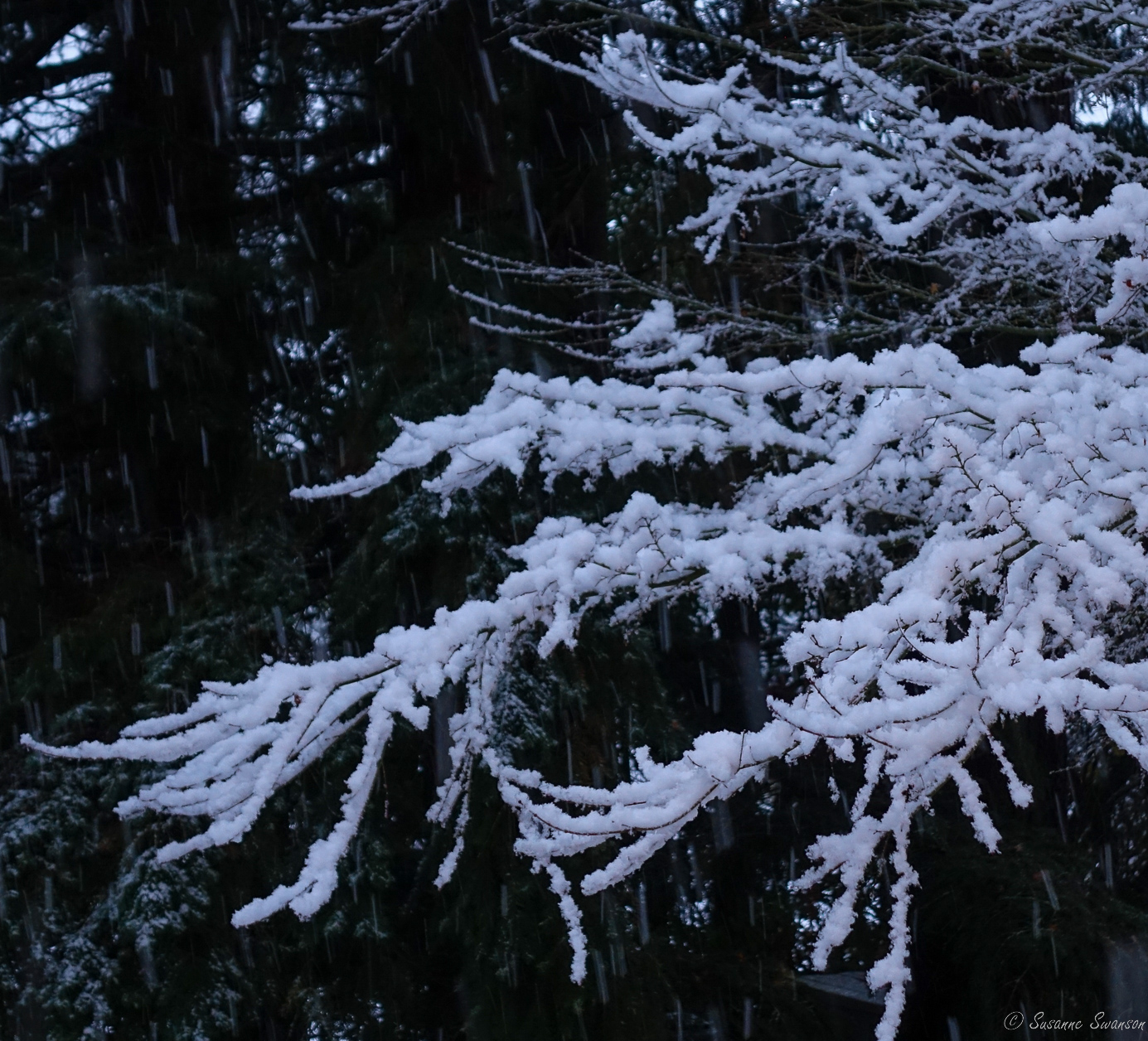 We have had that forecast here, still just occasional ice pellets raining down. But as much as so many in this area fervently wish for it, White Christmases are so rare that they only have happened six times over the past century. The Seattle of my childhood had many more than that. There was one Christmas eve my neighbor’s teen son decided to deliver Christmas cookies to families around the block via traveling on his Nordic (“cross country”) skis. Still wishing for a snowy Christmas Eve and morning with snow melted off the roads by noon. Sigh. More snow photos, please?