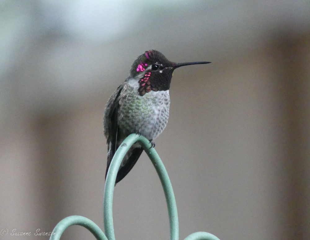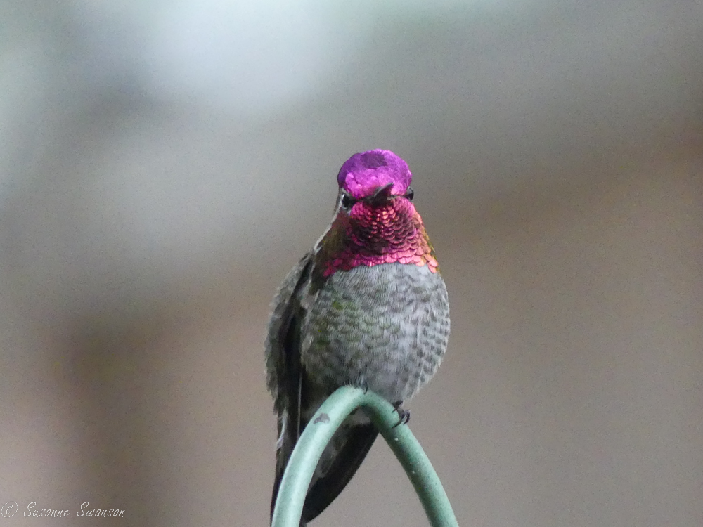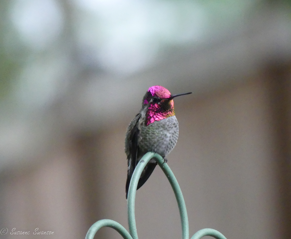 Gorgeous detail in those photos, you can almost feel how soft those gray front feathers would be. Also, I think your hummingbirds love you back – maybe more for their photo ops than for the feeder. Truly, they are posing for you and urging you with the question “did you get that magenta feathering?” I’ve been reading “The Bird Way” and apparently one researcher found that Anna’s Hummingbirds actually engage in actual bird play! So perhaps they are engaging with you in “bird play”!