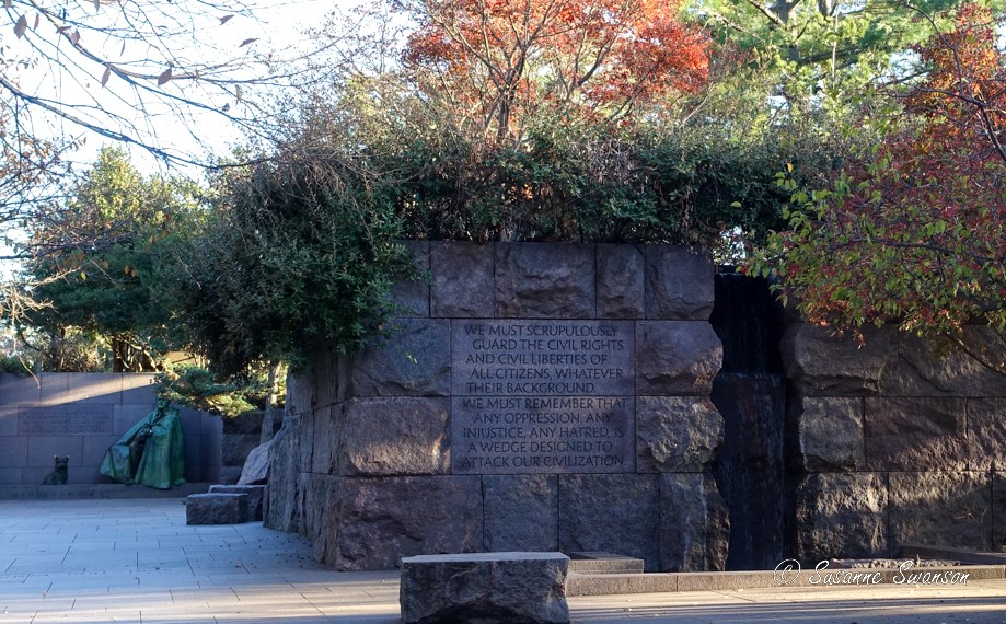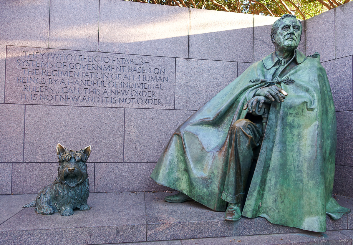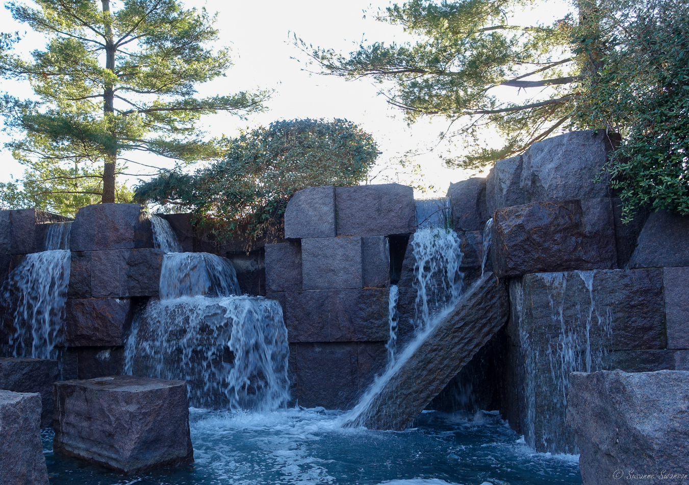 “President Bill Clinton dedicated the Franklin Delano Roosevelt (FDR) Memorial on May 2, 1997. Different from the previous presidential memorials, the FDR Memorial uses elements of stone, water, and landscaping to tell the story of FDRβs presidency in a more approachable way. Quotes are at eye level and the statues are at or close to ground level and were meant to be touched. The memorial consists of five outdoor rooms- one as a prologue and four for the unprecedented four terms of FDR. The fountains and pools placed throughout the memorial represent the important role water played in FDRβs life. The water features and the stones also help set the tone during different times in his presidency, from the reflection to chaos.” National Park Service website