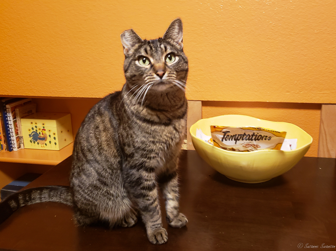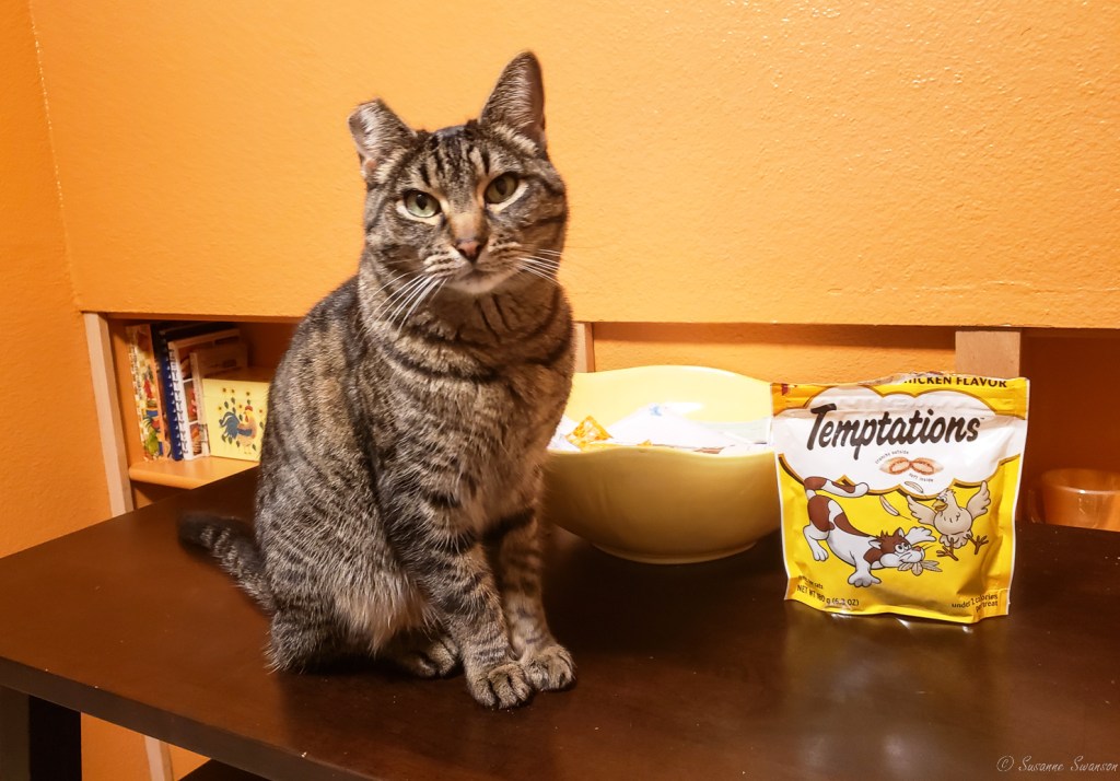 No, not just ordinary kitty temptations like batting the Kleenex off the shelf onto my head, or lying in wait to ambush his big brother, but rather Temptations of the snack variety.