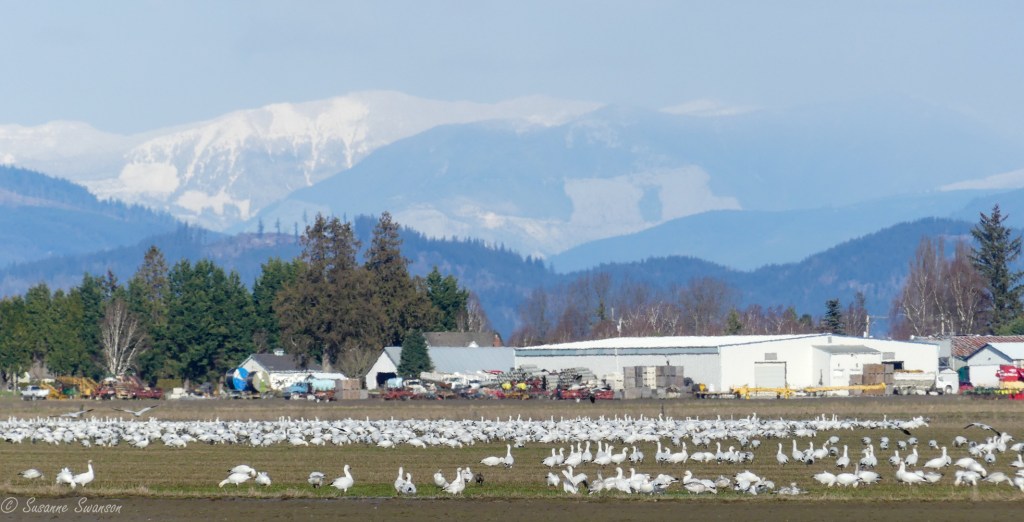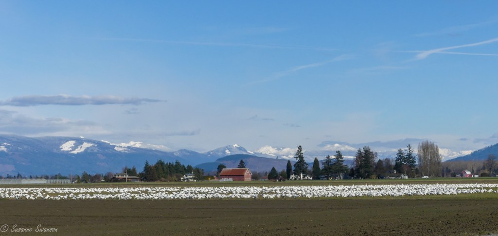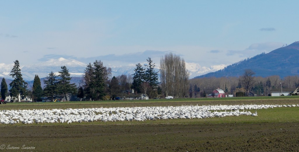 Have you ever visited the Skagit Valley during the winter to see the snowbirds? We did last week and discovered thousands of swans (trumpeter and tundra though I’m hard pressed to tell the difference) and snow geese, much easier to identify with the black feathers and markings. These visitors come all the way from Wrangell Island, Russia for the winter.