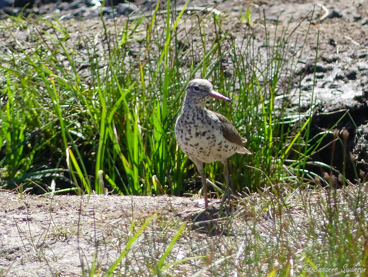 While he fished, I wandered about with my camera and came across a bobbing bird, a Spotted Sandpiper, I believe. It was getting food for its young, which I saw peeking out from the shrubs.