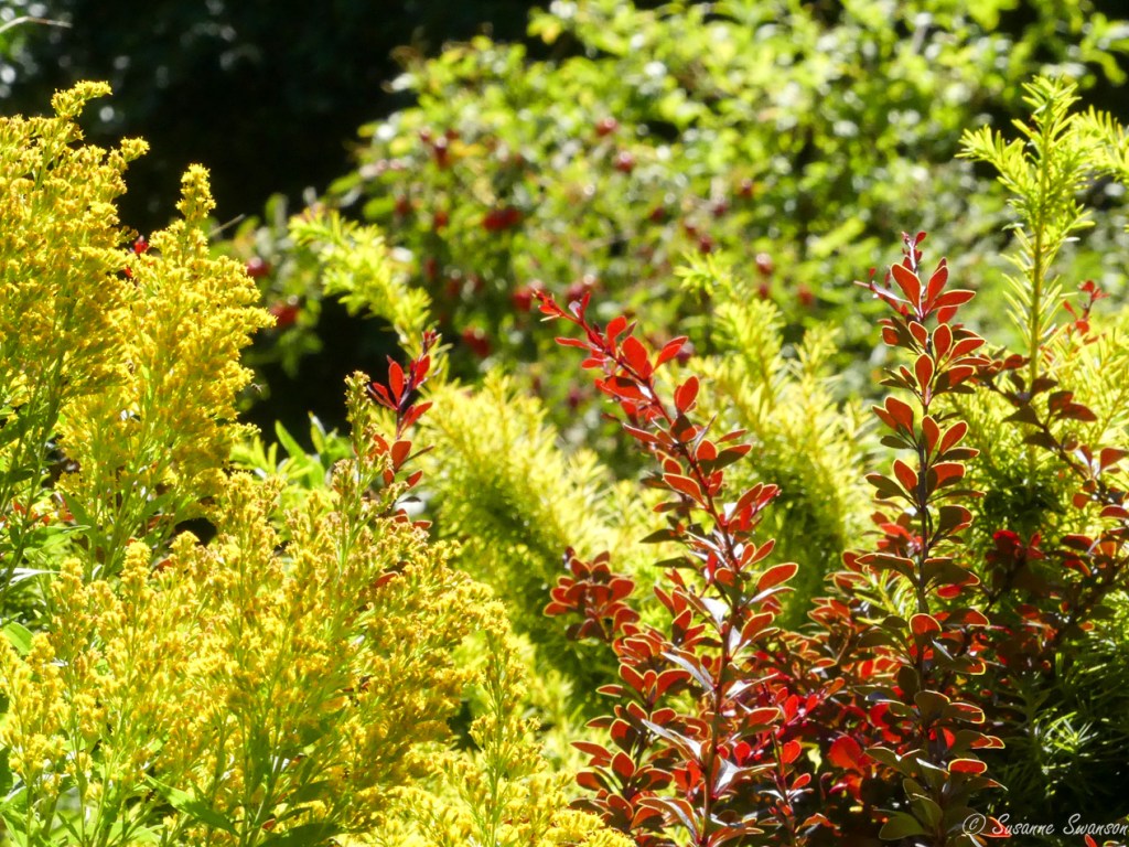 The secret to gardening is planting flowers and shrubs with complementary colors.