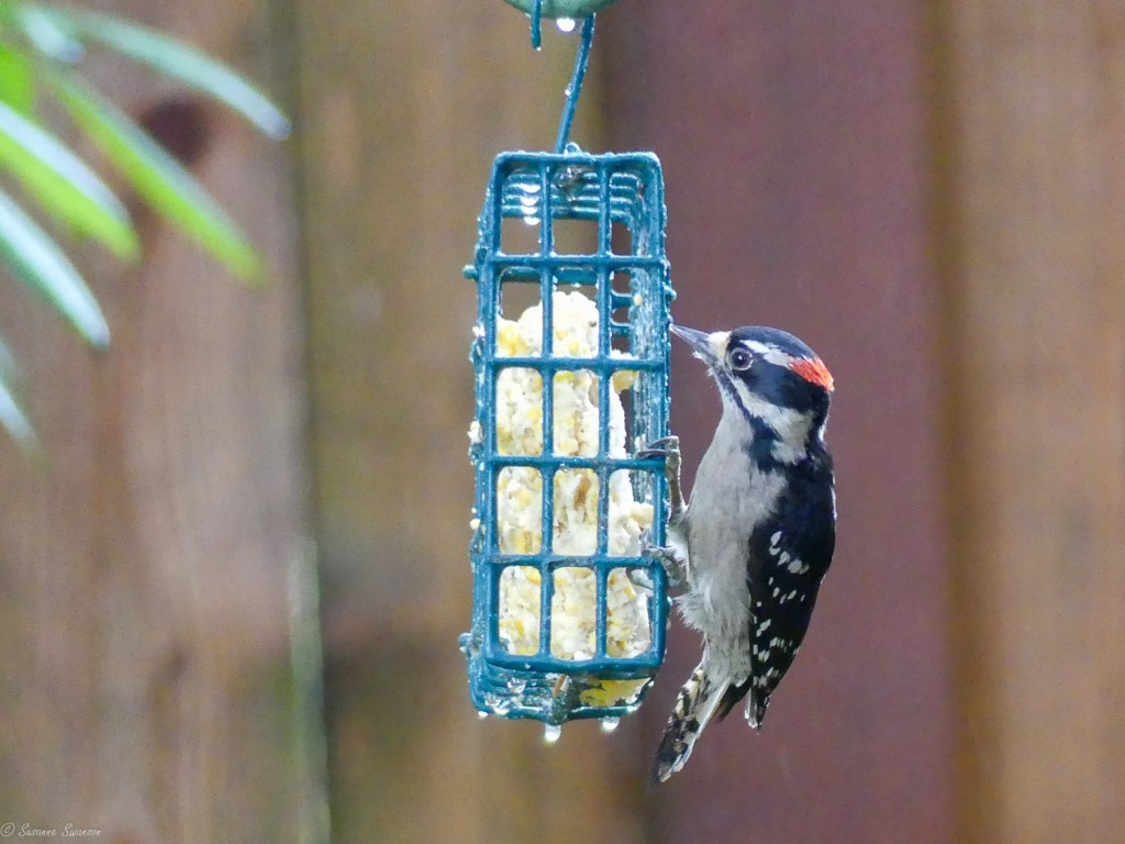 Lucky for me, I was still outside with my camera when the Downy Woodpecker returned, and I got several shots of the handsome boy. Seems like he may become a regular, hooray!