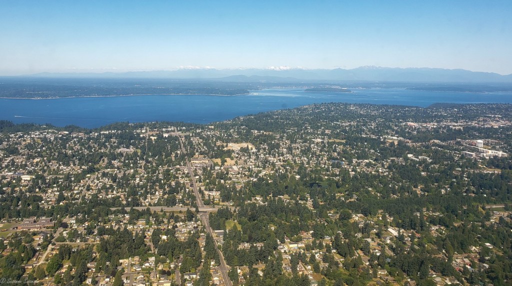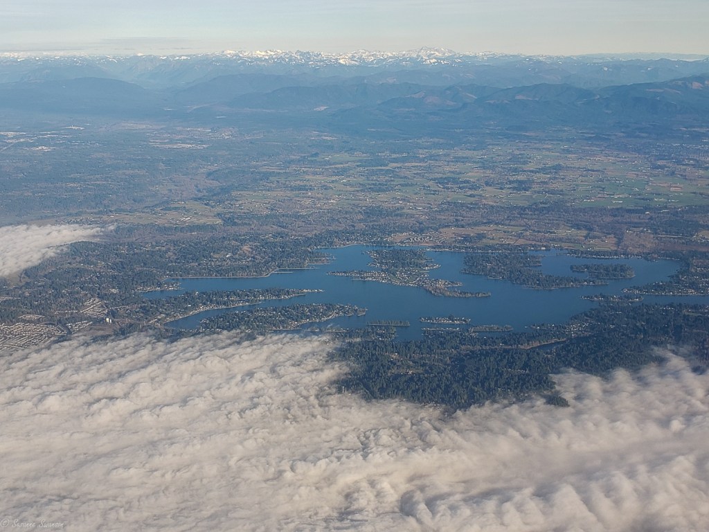 When we fly out of SeaTac I try to get a window seat on the left side of the plane for close up views of Mt. Rainier. This worked well on last month’s trip to San Diego. This was the view facing east toward the Cascade Mountains and Lake Tapps, minutes before the mountain came into view.