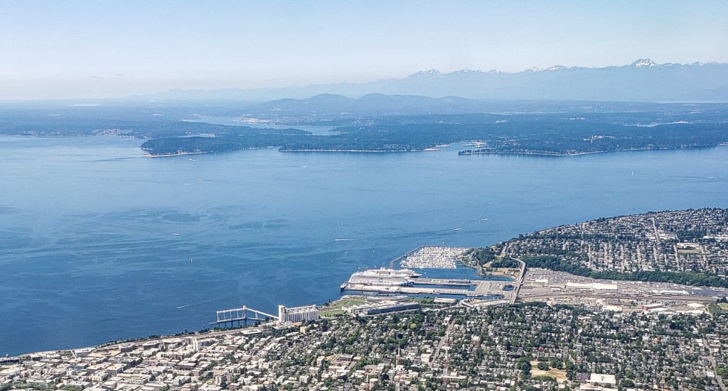 Sometimes the pilot heads north before going south and I catch good views of Seattle, Puget Sound and the Olympic Mountains. The pictures below are from last summer’s trip to S. California, so not much snow can be seen on the Olympics. The first two were leaving town.