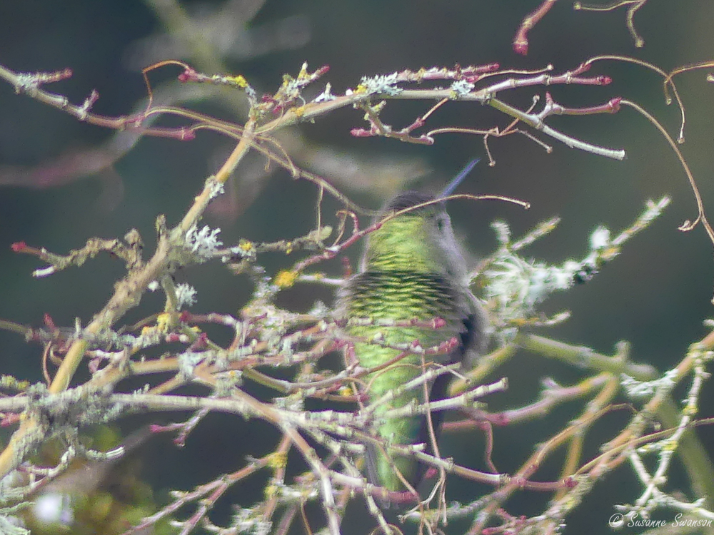Within a few minutes, a hummingbird was feeding, and afterwards rested in the branches.
