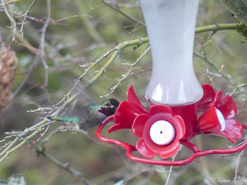 After I took these pictures, I went out to replace the feeder as this one was already freezing. A hummingbird hovered nearby and waited, and immediately began to feed when it was back up.