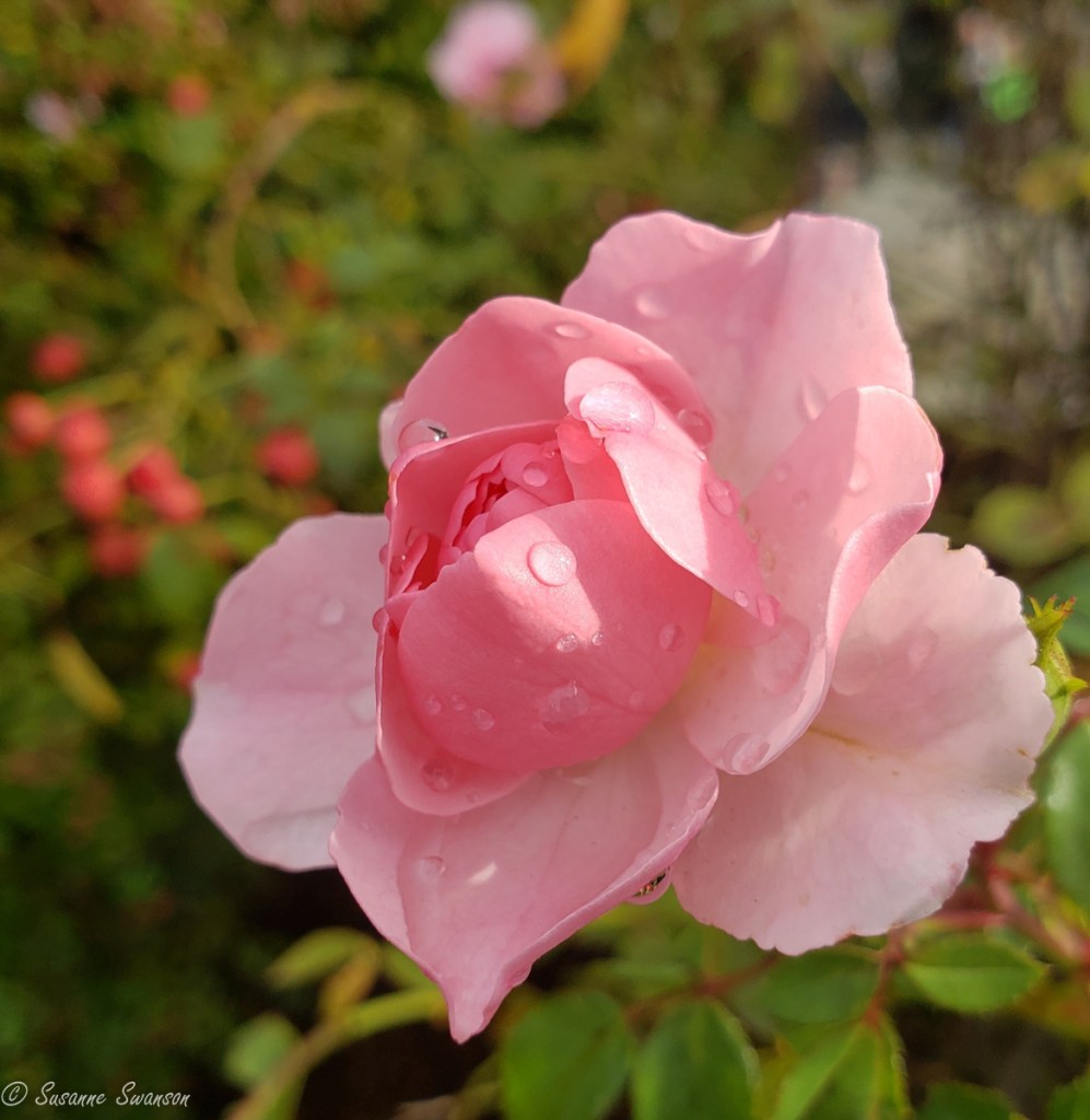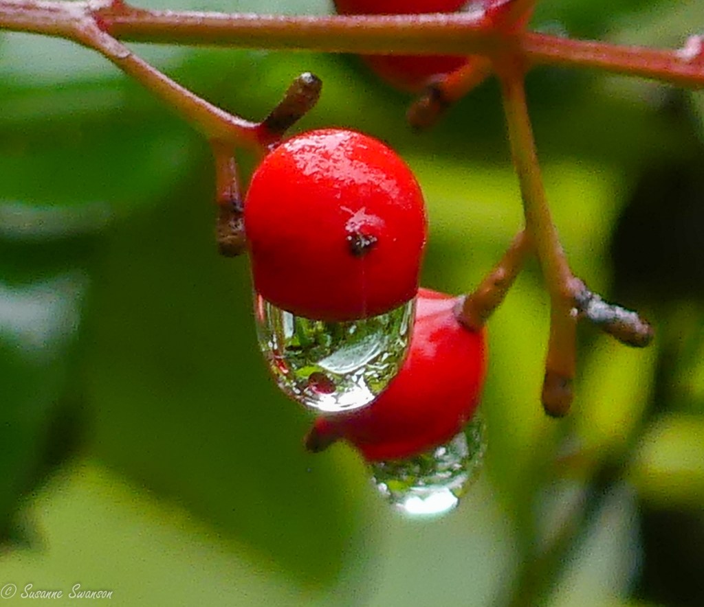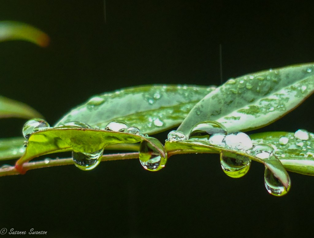 Though I was looking for red and pink for this week’s Sunday Stills Challenge, I firstly found raindrops on green.