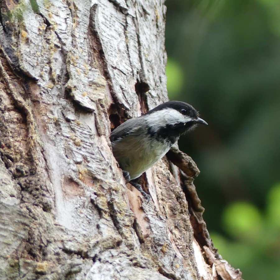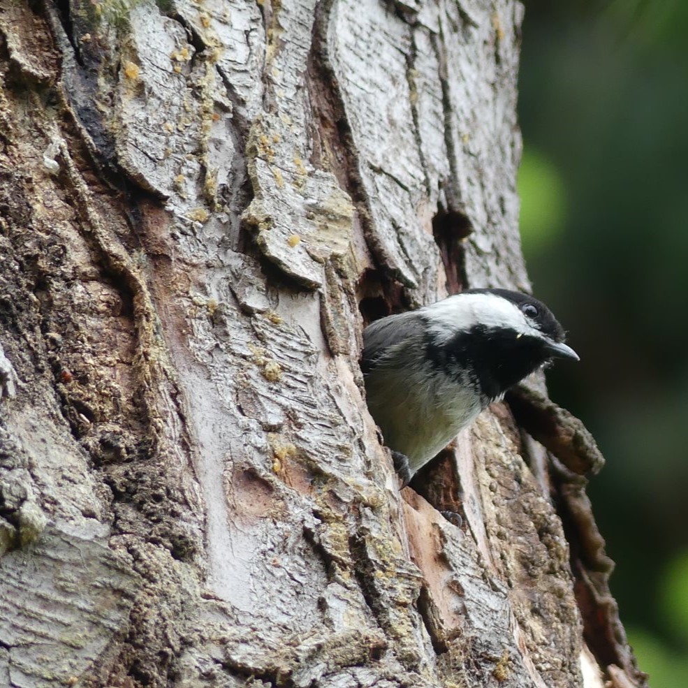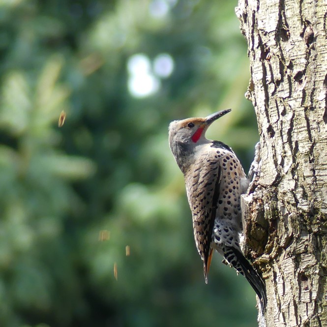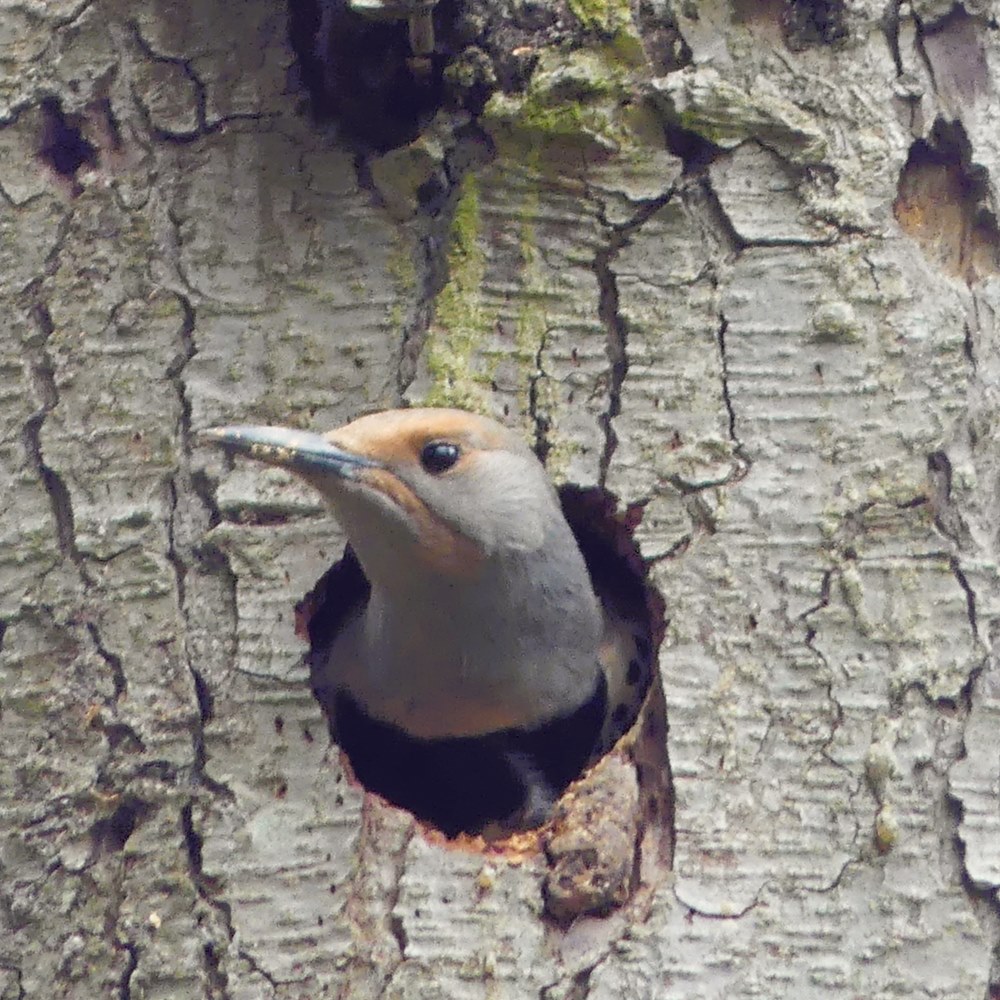 But the Northern Flickers aren’t the only ones using the snag. They’re pleased to share with their smaller friends including black-capped chickadees, who’ve taken up residence on the other side, after doing their own renovations.