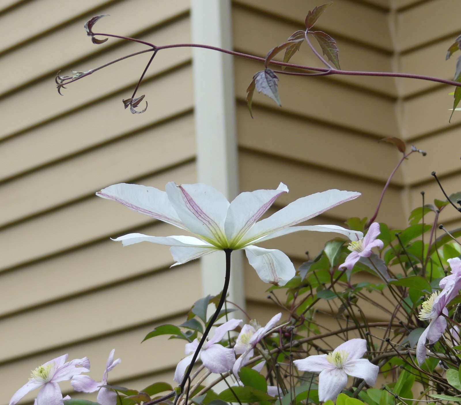 But rising above the fray, here and there, is another clematis with large white blossoms few and far between. It stays put year after year and the blossoms face heavenward, too high for me to easily photograph so I rarely do. You’ll see it poking its head above its pink cousin below.