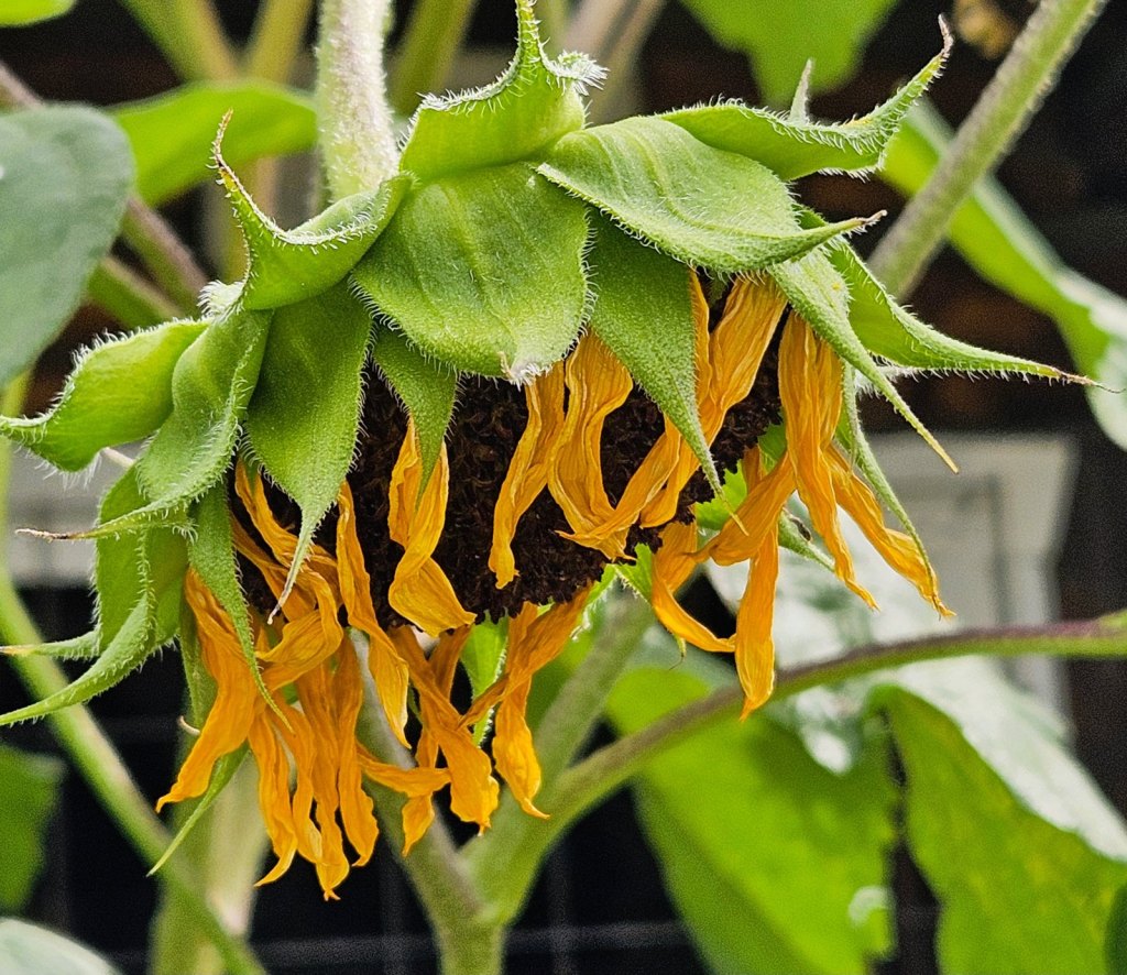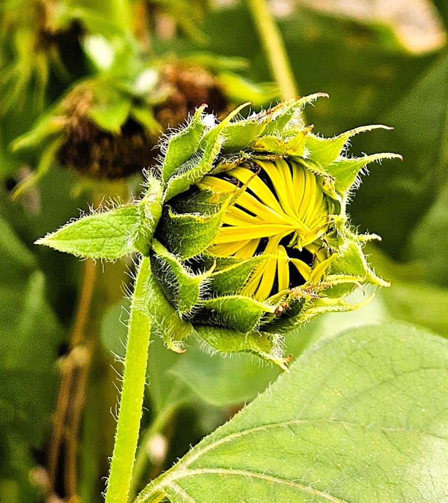 I found a sunflower, all wound up and tightly coiled, before blooming;
