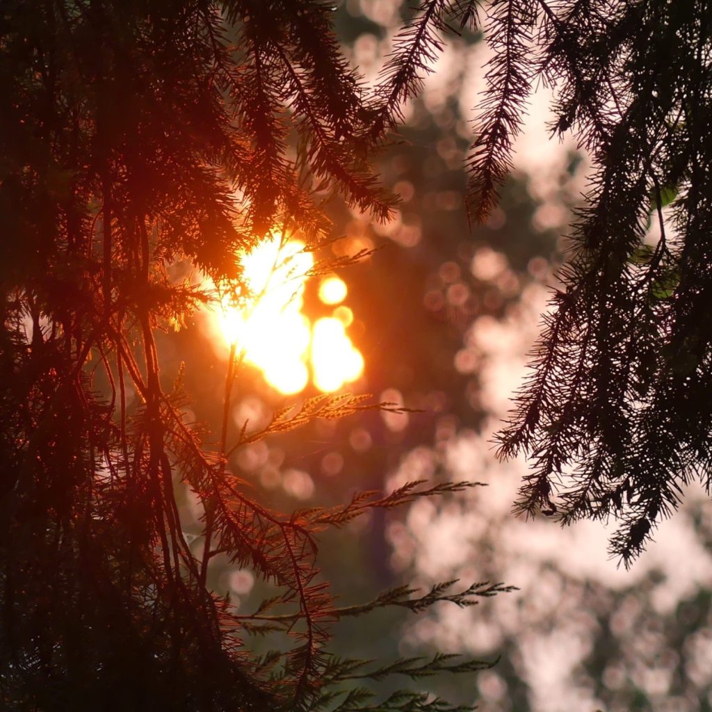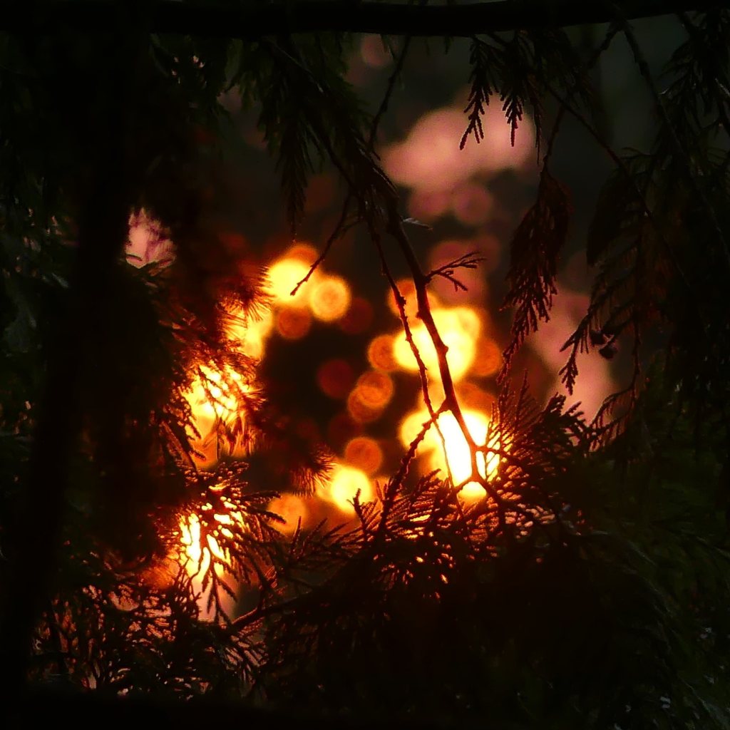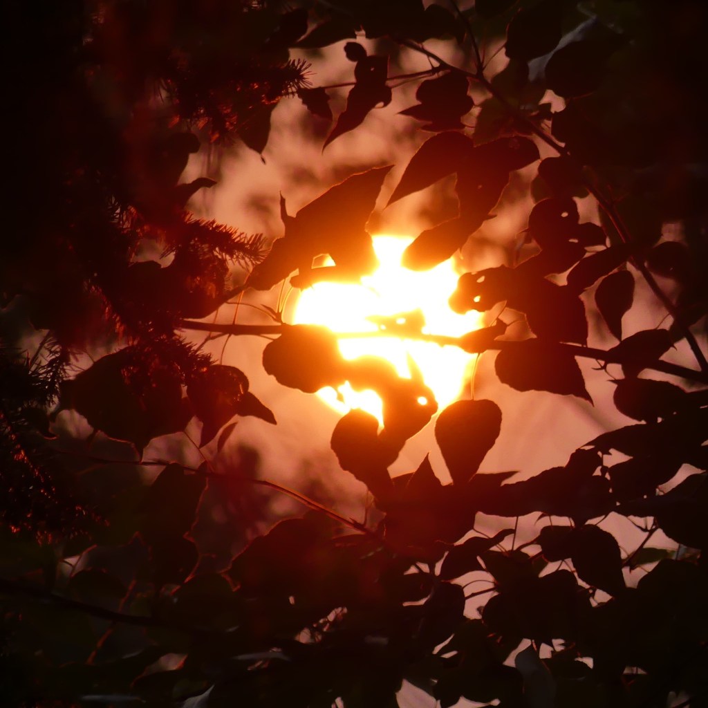 The sun rose a huge ball of fire over my backyard, suspended, brilliant, through the trees.