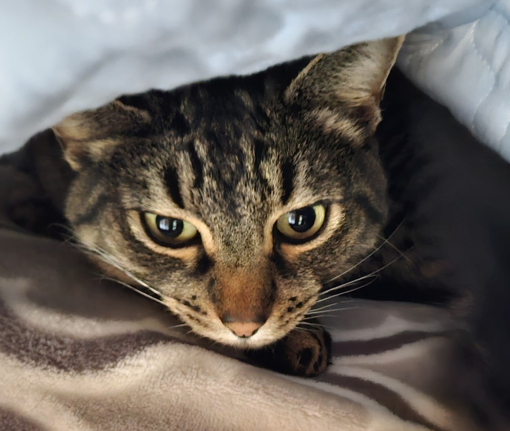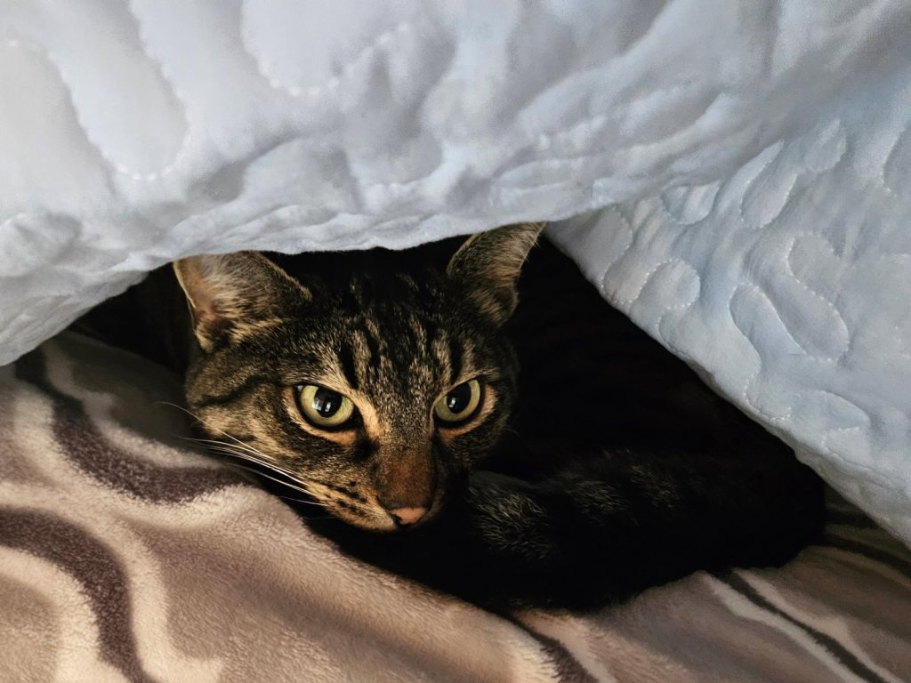 I had to laugh when I saw him hiding under the bedspread! A bit gun-shy after Halloween.