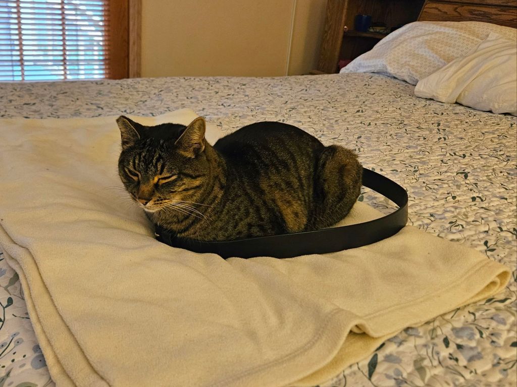 I know cats love to sit in things, but a belt is a new one on me, Susanne.