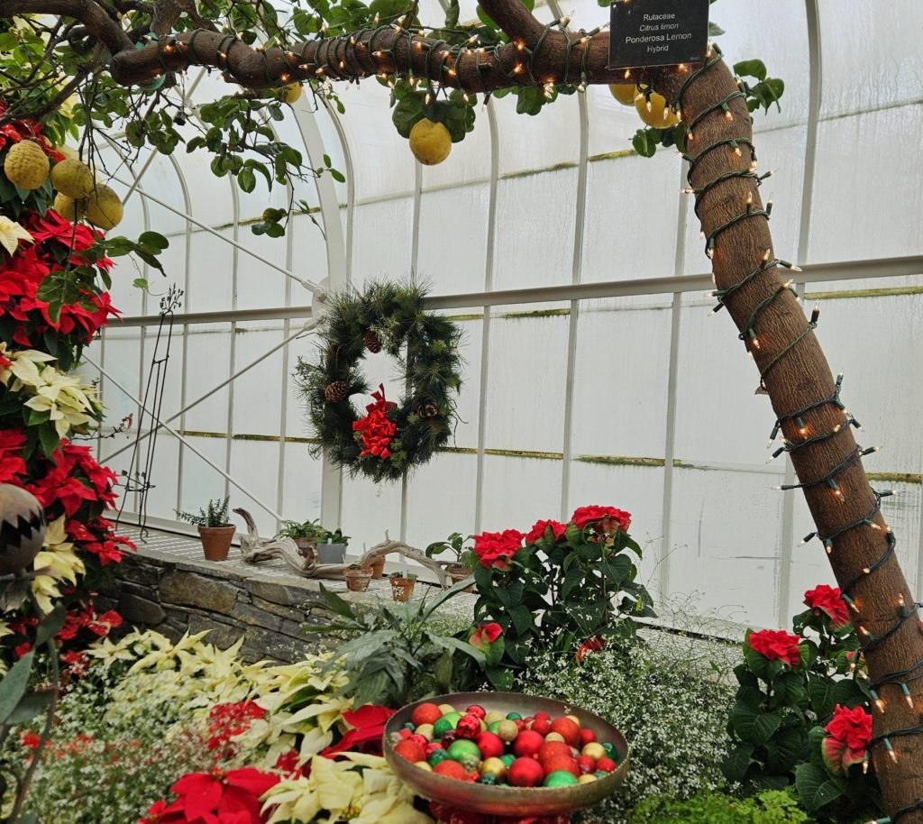 there was a conservatory, filled with interesting plants and festive decorations, many metallic.