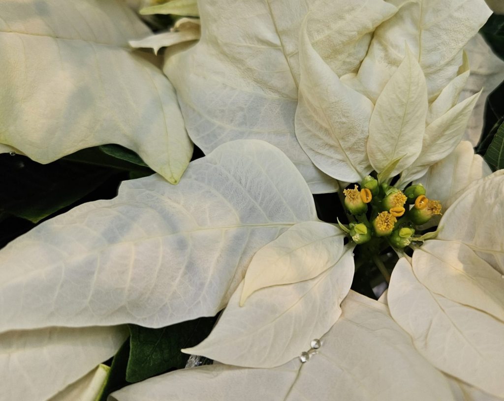 Most poinsettias in the United States today are grown in California. The beauty is in the colored leaves or bracts, the tiny flowers in the middle mostly go unnoticed.