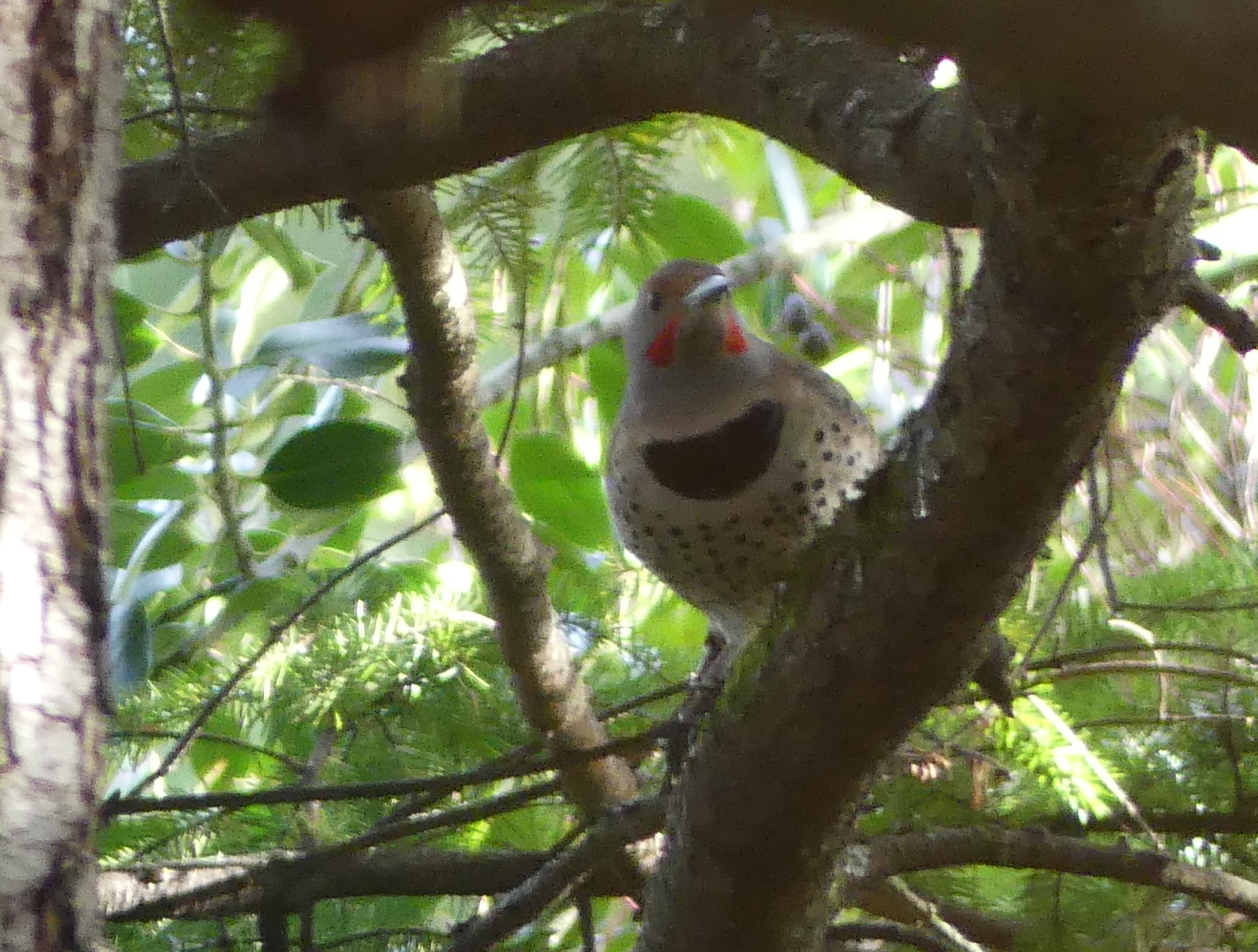 A male Flicker swooped in and dwarfed them all, landing on a Douglas fir tree, to hunt for bugs.