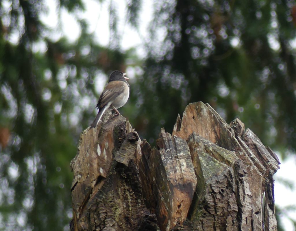 Meanwhile in the backyard, house finches are busily courting, the handsome male in a rust-colored tuxedo.