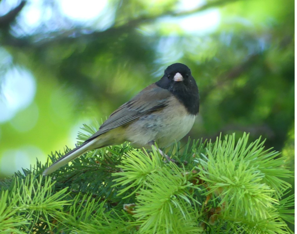 The Juncos are plentiful, feeding on the ground and in the trees above, including in the Douglas Fir, where you can see tender new growth. I’ve had to discourage these friendly birds from nesting in garden pots and under the back deck, for their safety from you-know-who.