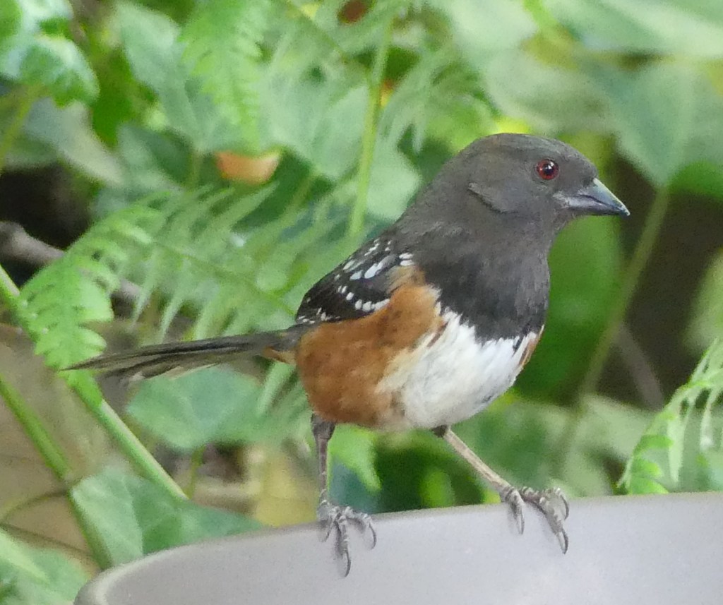 The Rufous-sided Towhee is larger than other songbirds, but smaller than the Robin it resembles. They’re distinctive ground feeders and appreciate the birdbaths I’ve scattered about the yard.