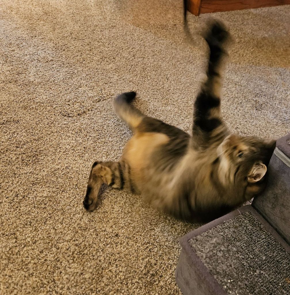 My sweet boy waits at the foot of our bed, where his special stairs are, with his favorite toy nearby, a leftover piece of rubber tubing, hoping we take the bait. We do, a few times a day.
