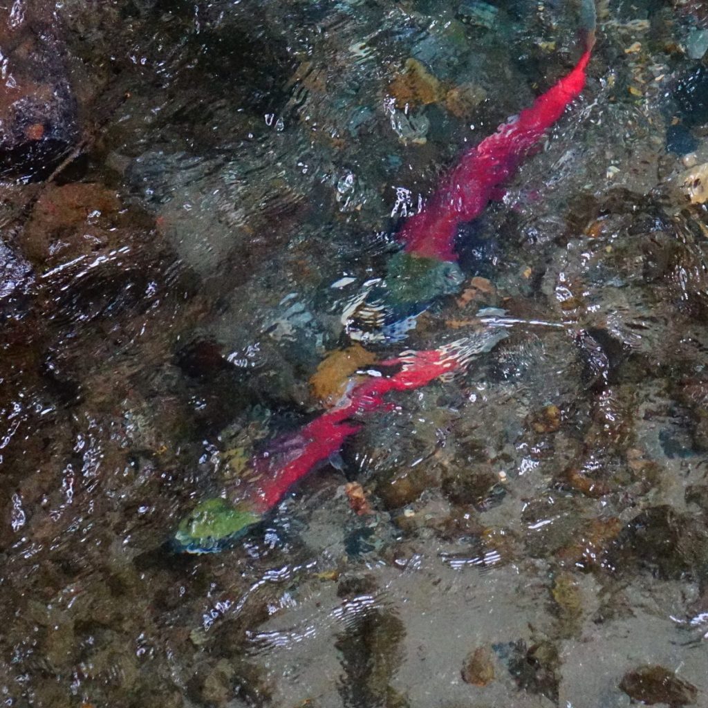 “In September, adult Sockeye head up the Cedar River as it swells with new rainfall. As they migrate upstream their bodies transform to display their dramatic spawning colors.”