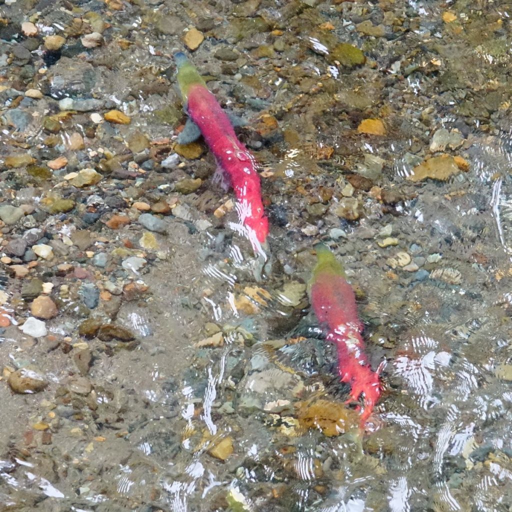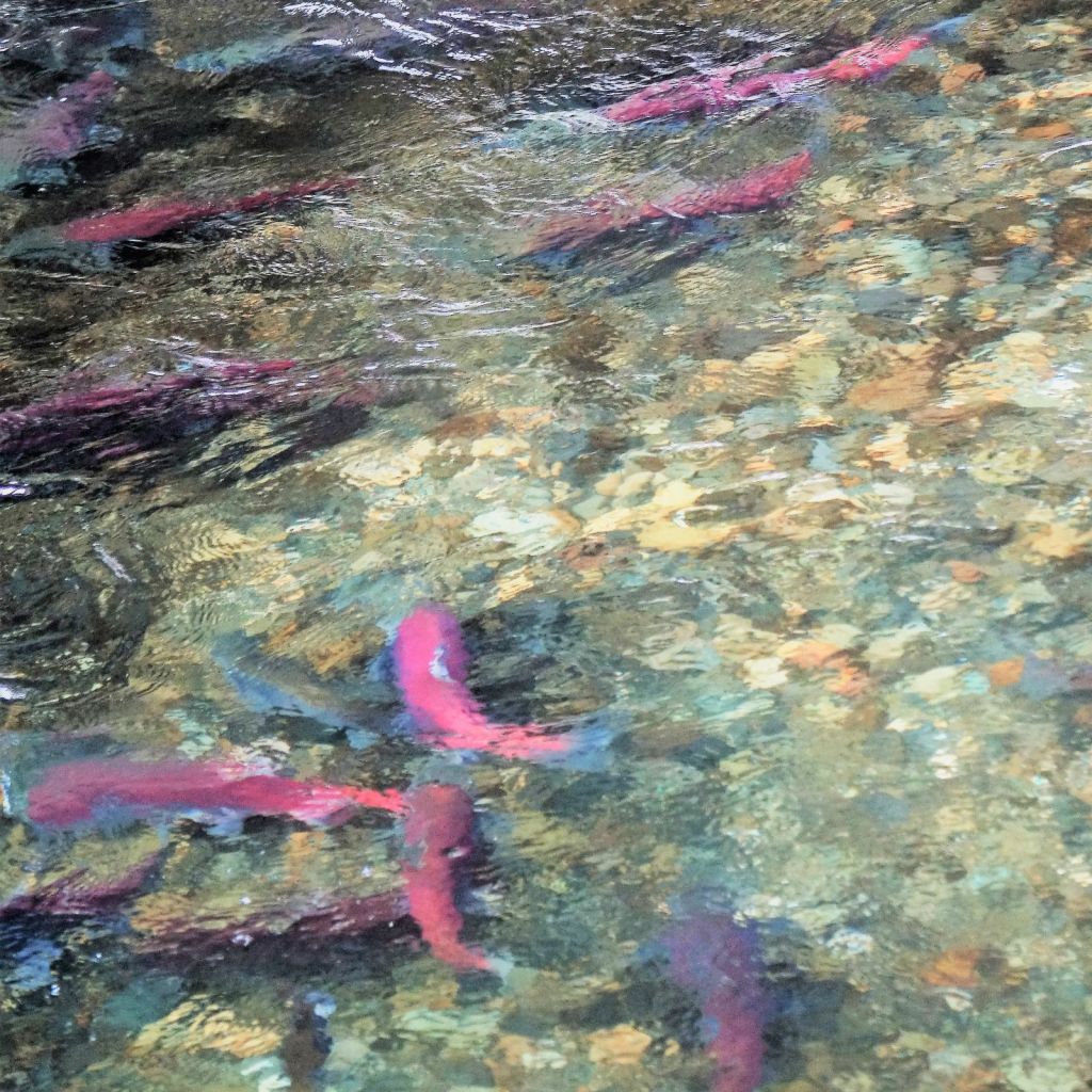“Soon after spawning, the adults die. The nutrients from their decomposing bodies are added to the base of the food chain that supports the salmon ecosystem.”
